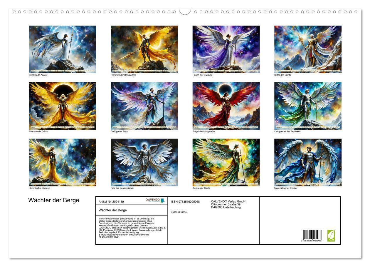 Dieser Kalender wurde von KI erschaffen und entführt Sie in ein farbenfrohes Reich himmlischer Gestalten. Anmutige Engelritter erstrahlen in leuchtender Schönheit, auf einem majestätischen Berg thronen, die schützenden Hüter einer Welt voller Licht und Poesie....