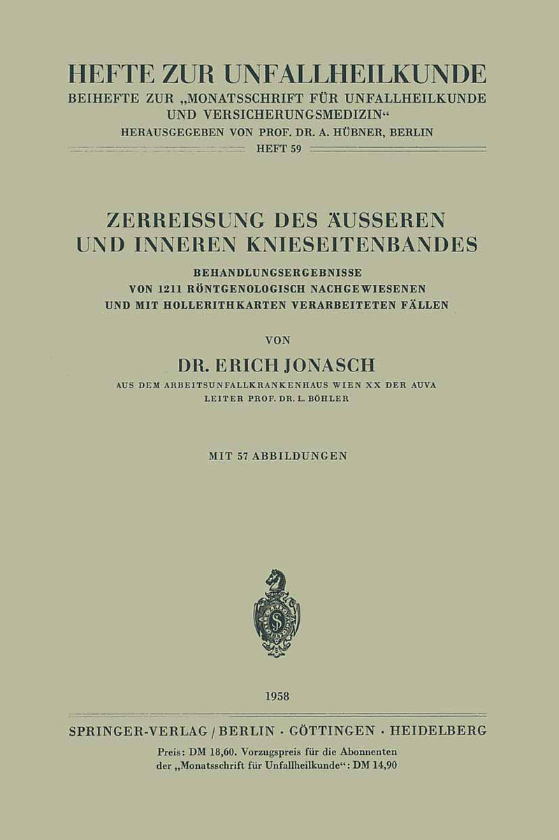Übersicht über die Literatur der Knieseitenbandzerreißungen.- I. Anatomie der Seitenbänder.- II. Aufgaben, Funktion und Verhalten der Seitenbänder des Kniegelenkes.- III. Experimentelle Untersuchungen an den Knieseitenbändern.- IV. Verletzungsmechanismus.- V. Pathologisch-anatomische Befunde bei der frischen Verletzung der Knieseitenbänder.- VI. Heilung der Seitenbandrisse (Experimentelle Studie).- VII. Symptomatik.- VIII. Klinische Untersuchung.- IX. Röntgenuntersuchung.- X. Behandlung der Zerreißungen der Knieseitenbänder.- XI. Nachbehandlung der Zerreißungen der Knieseitenbänder.- XII. Zerreißung des äußeren Knieseitenbandes mit Verletzung des Nervus peroneus.- XIII. Seitenbandzerreißung und Tabes.- XIV. Seitenbandzerreißung und spinale Kinderlähmung.- XV. Seitenbandzerreißung und Morbus Paget.- XVI. Stiedascher Schatten und Bandverknöcherungen nach Zerreißung der Knieseitenbänder.- XVII. Behandlungsergebnisse der Knieseitenbandzerreißungen.- XVIII. Begutachtung der Knieseitenbandzerreißung.- XIX. Berentung nach Knieseitenbandzerreißung.- Zusammenfassung.- Literatur.- Namenverzeichnis.
