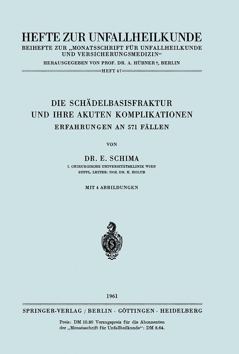 I. Einleitung.- II. Alter und Geschlecht der Verletzten.- III. Ursachen der Schädelbasisfrakturen.- IV. Pathologische Anatomie der Schädelbasisfrakturen, Verlauf der Bruchlinien.- V. Symptome der Schädelbasisfraktur.- 1. Hämatome.- 2. Blutungen nach außen.- 3. Austritt von Schädelinhalt.- 4. Eintritt von Luft in das Schädelinnere.- 5. Hirnnervenstörungen.- VI. Die Röntgendiagnose der Schädelbasisfraktur.- VII. Begleitende Verletzungen des Schädelinhaltes, Komplikationen der Schädelbasisfrakturen und spezielle diagnostische Methoden zu deren Erkennung.- 1. Verletzungen des Gehirnes.- 2. Posttraumatische Psychosen.- 3. Epidurale Hämatome.- 4. Subdurale Hämatome.- 5. Kombination von epi- und subduralem Hämatom.- 6. Intracerebrale Hämatome.- 7. Liquorfisteln.- 8. Pneumatocelen.- 9. Sinusitis, Otitis, PseudoCholesteatom.- 10. Meningitis, Hirnabsceß.- 11. Das arterio-venöse Aneurysma der A. carotis int. im Sinus cavernosus.- 12. Endokrine Störungen.- VIII. Begleitende Verletzungen des Gesichtsschädels.- IX. Zusätzliche Verletzungen außerhalb des Schädels.- X. Die Behandlung der Schädelbasisbrüche.- 1. Allgemeines.- 2. Besondere Therapie der Brüche der vorderen Schädelbasis.- 3. Besondere Therapie der Schläfenbeinbrüche.- 4. Besondere Therapie der Hirnnervenschäden.- XI. Die Therapie der Gehirnverletzungen und der endokraniellen Frühkomplikationen bei Schädelbasisfrakturen.- 1. Die Therapie der Gehirnverletzungen.- 2. Die Therapie der endokraniellen Blutungen.- 3. Die Therapie des arteriovenösen Carotisaneurysma im Sinus cavernosus.- 4. Die Therapie der Sinusitis, Otitis, Meningitis und der Pneumatocelen.- XII. Mortalität und Todesursachen bei Schädelbasisbrüchen, Behandlungsdauer.- XIII. Zusammenfassung.- Literatur.