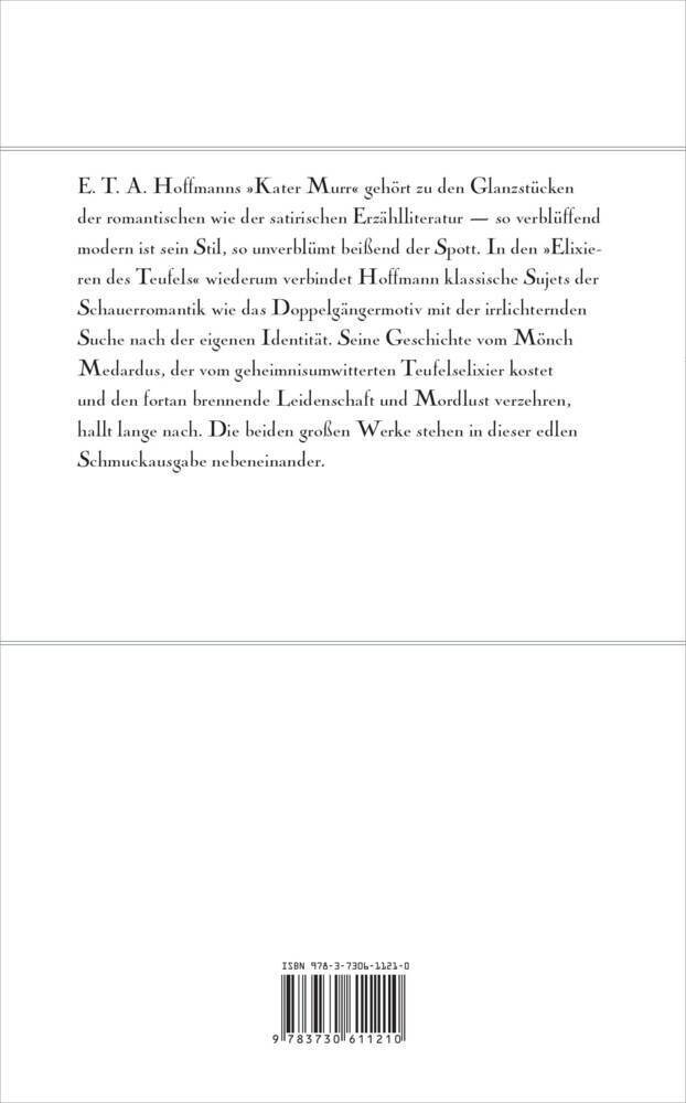 E. T. A. Hoffmanns »Kater Murr« gehört zu den Glanzstücken der romantischen wie der satirischen Erzählliteratur so verblüffend modern ist sein Stil, so unverblümt beißend der Spott. In den »Elixieren des Teufels« wiederum verbindet Hoffmann klassische Sujets d...