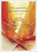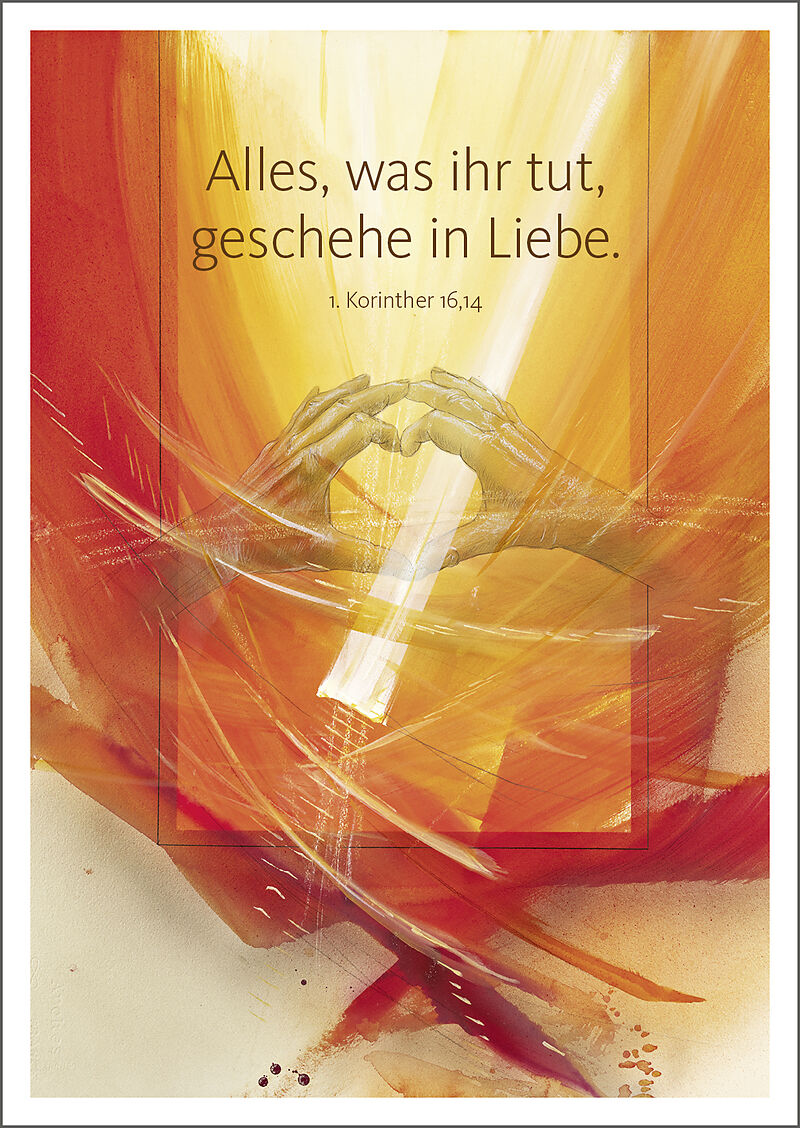 Das Motiv von Eberhard Münch zur Jahreslosung 2024, von einem der bekanntesten christlichen Künstler in leuchtenden Farben interpretiert. »Alles, was ihr tut, geschehe in Liebe.« 1. Kor 16,14 Die Welt, die uns umgibt, scheint immer rauer zu werden. Krisen bed...