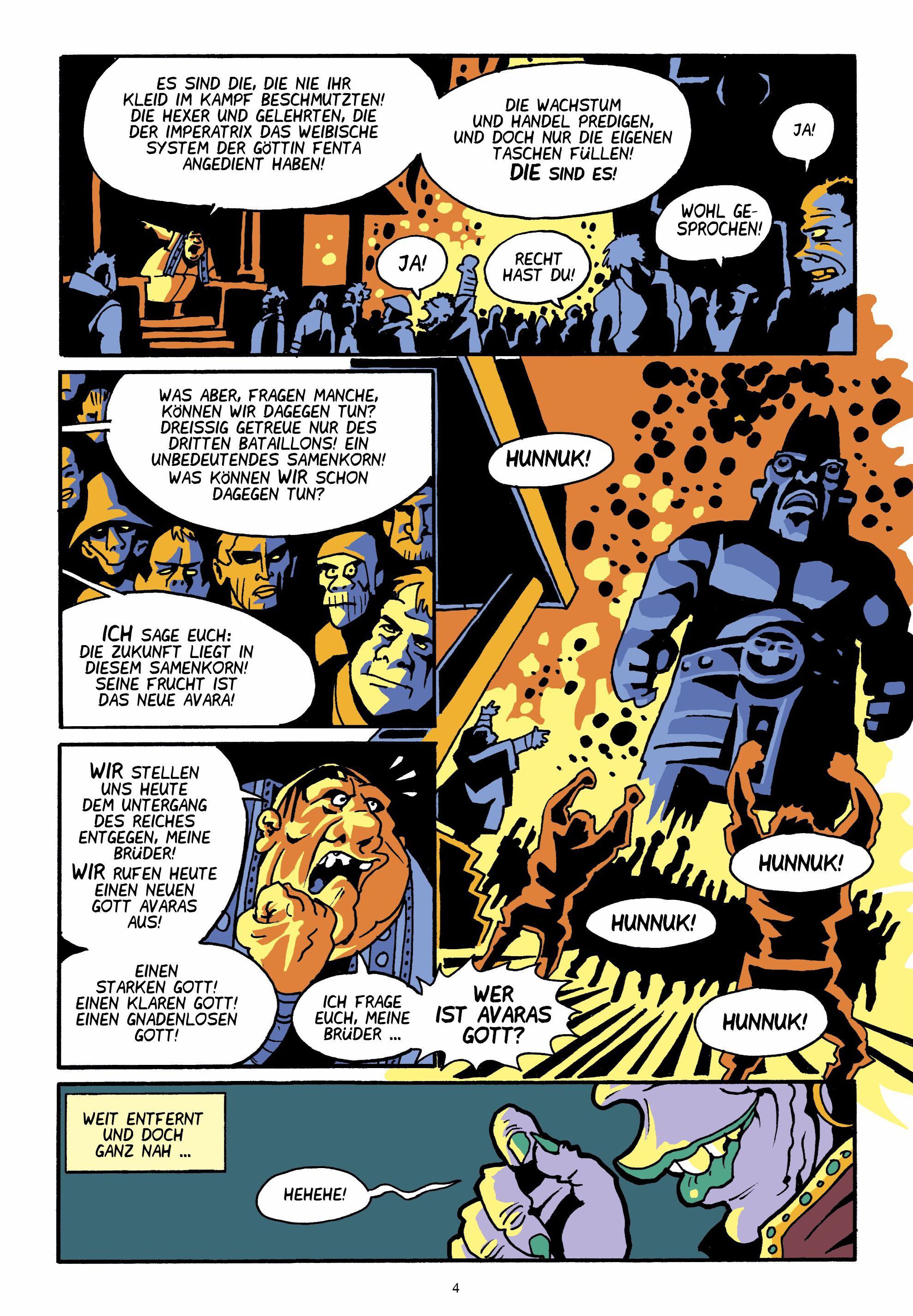 Wohin sollen sich die von Luba malträtierten Dreier wenden? Wer bleibt, wenn Avara und seine dekadente Herrscherkaste den verfolgten Veteranen kein Gehör mehr schenken? "Hunnuk!" hallt es über alte Altäre, "Hunnuk ist Euer Gott!" Und die Reste der Legion folge...