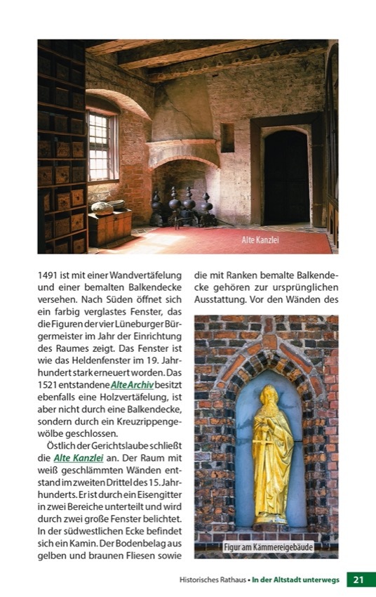 Geschichtliches Lüneburg und das Salz - Entstehung und Herrschaft - Salz bringt Wohlstand - Der Übergang zur Neuzeit - "Beamtenstadt" Lüneburg Die Entdecker-Touren Entdecker-Tour 1 In der Altstadt unterwegs Marktplatz - Historisches Rathaus - Herzogliches Stadtschloss - Lüneburger Hausarchitektur - Große Bäckerstraße Glockenstraße - Am Berge Wandfärberstraße - St. Johanniskirche - Am Sande - Museen und allerlei Kunst: Brauereimuseum - Ostpreußisches Landesmuseum - Deutsches Salzmuseum - Kunstsammlung Claassen - Flanier- und Bummelmeile - Grapengießerstraße - An der Münze - Westliche Altstadt: Auf dem Meere - Untere Ohlingerstraße - Auf der Altstadt - St. Michaeliskirche - Adressen und Öffnungszeiten Entdecker-Tour 2 An der Ilmenau bummeln Wasserviertel - Lünertorstraße - Kaufhaus - Alter Kran - Lüner Mühle - Abtsmühle und - Abtswasserkunst - Stintmarkt - Viskulenhof - Auf dem Kauf - Stift Roter Hahn - St. Nicolaikirche - Bei der Ratsmühle - Kalandhaus - Museum Lüneburg - Adressen und Öffnungszeiten - Theater - Kultur - Feste Ausflüge Vom Kloster in die Heide Kloster Lüne - Drehort Lüneburg Rote Rosen - Ausflüge in die Umgebung - Adressen und Öffnungszeiten - Tourist-Information - Freizeit, Essen, Übernachten - Kleine Fachkunde - Straßenverzeichnis