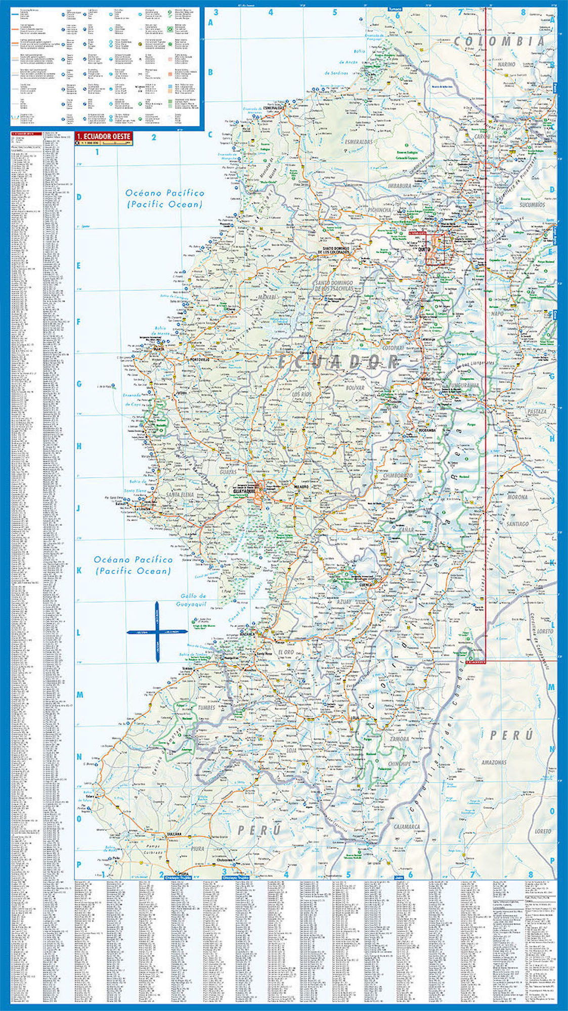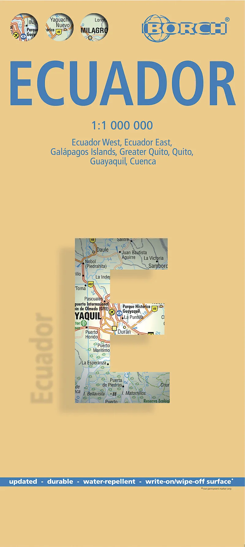 Our laminated and folded Borch Map of Ecuador in the 11th edition contains: Ecuador West 1:1 000 000, Ecuador East 1:2 000 000, Galapagos Islands1:1 300 000, Gran Quito 1:100 000, Quito 1:20 000, Cuenca 1:17 000, Guayaquil 1:18 000 and an administrative map of...