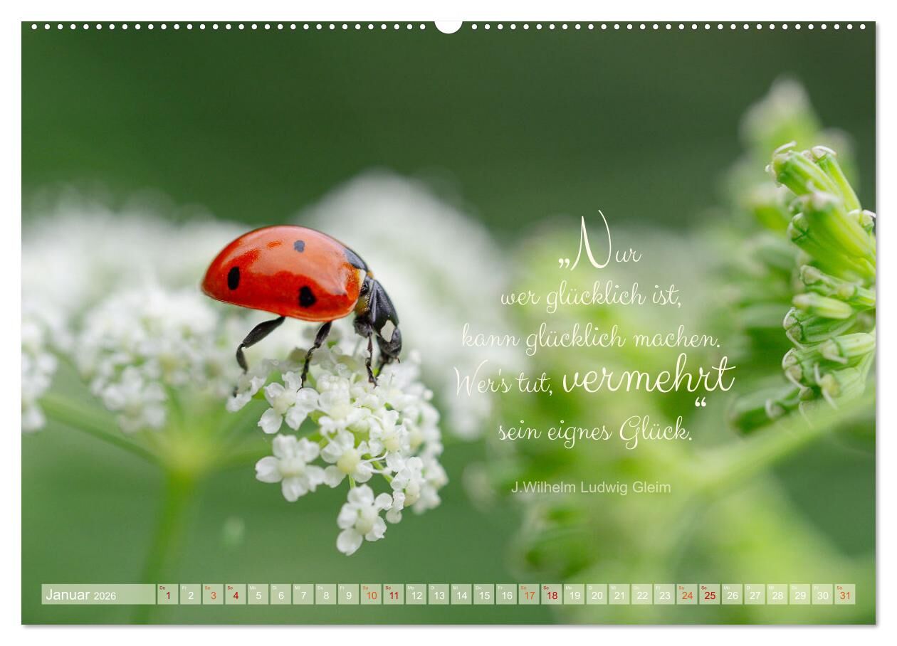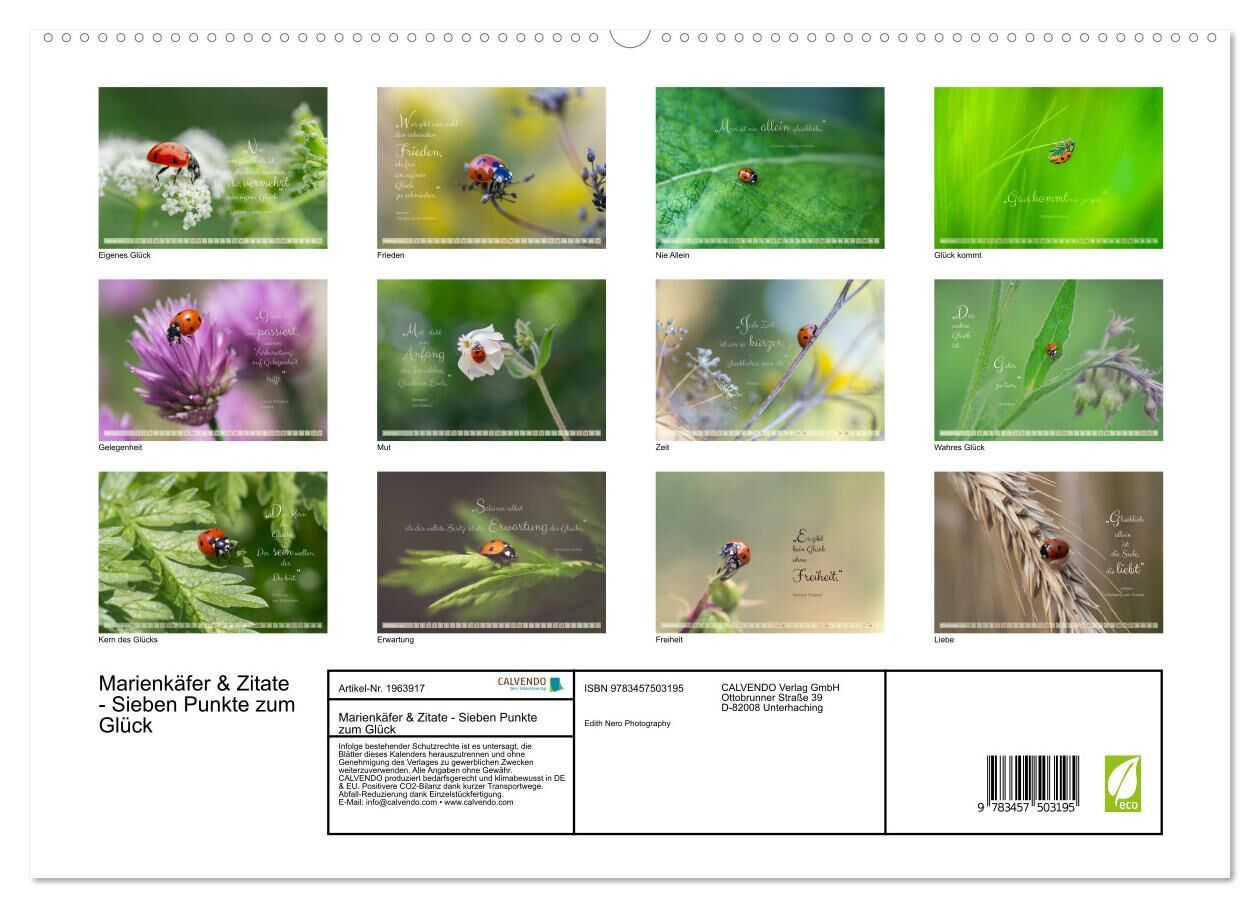 Ein Kalender voller Glück: Tauchen Sie ein in die Welt der Marienkäfer. Die Fotografin hat sie allesamt in ihrer natürlichen Umgebung aufgenommen. Lassen Sie sich von den lebendigen Farben der Motive bezaubern. Jeder Monat präsentiert Ihnen einen kleinen Glück...