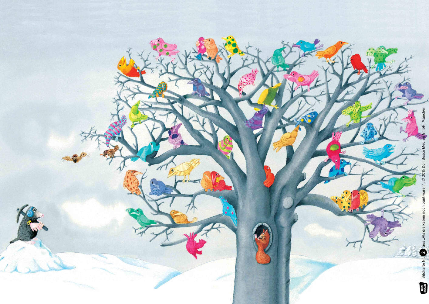 Die Raben waren nicht immer rabenschwarz. Vor langer Zeit waren sie kunterbunt und leuchteten in allen Regenbogenfarben: Es gab türkisfarbene Raben mit lila Tupfen und auch gelbe Raben mit roten Streifen. Sie lebten fröhlich miteinander und alle Tiere hatten ihre Freude an ihnen. Doch eines Tages stellte der Schneemann eine Frage, die alles verändern sollte: "Wer von euch Raben hat eigentlich die richtige Farbe?" - Themen "Mobbing", "Rechthaberei" und "Diversität".