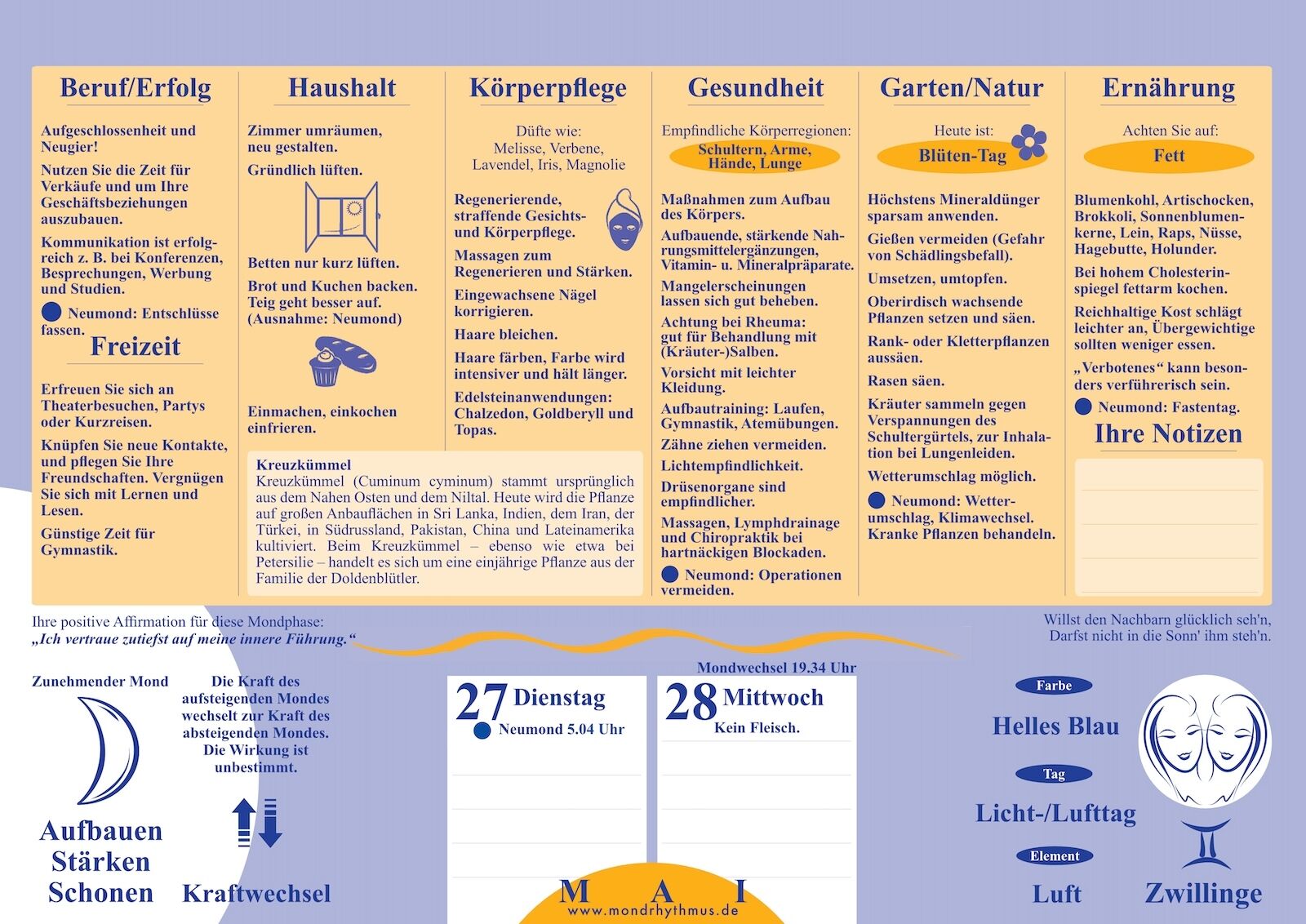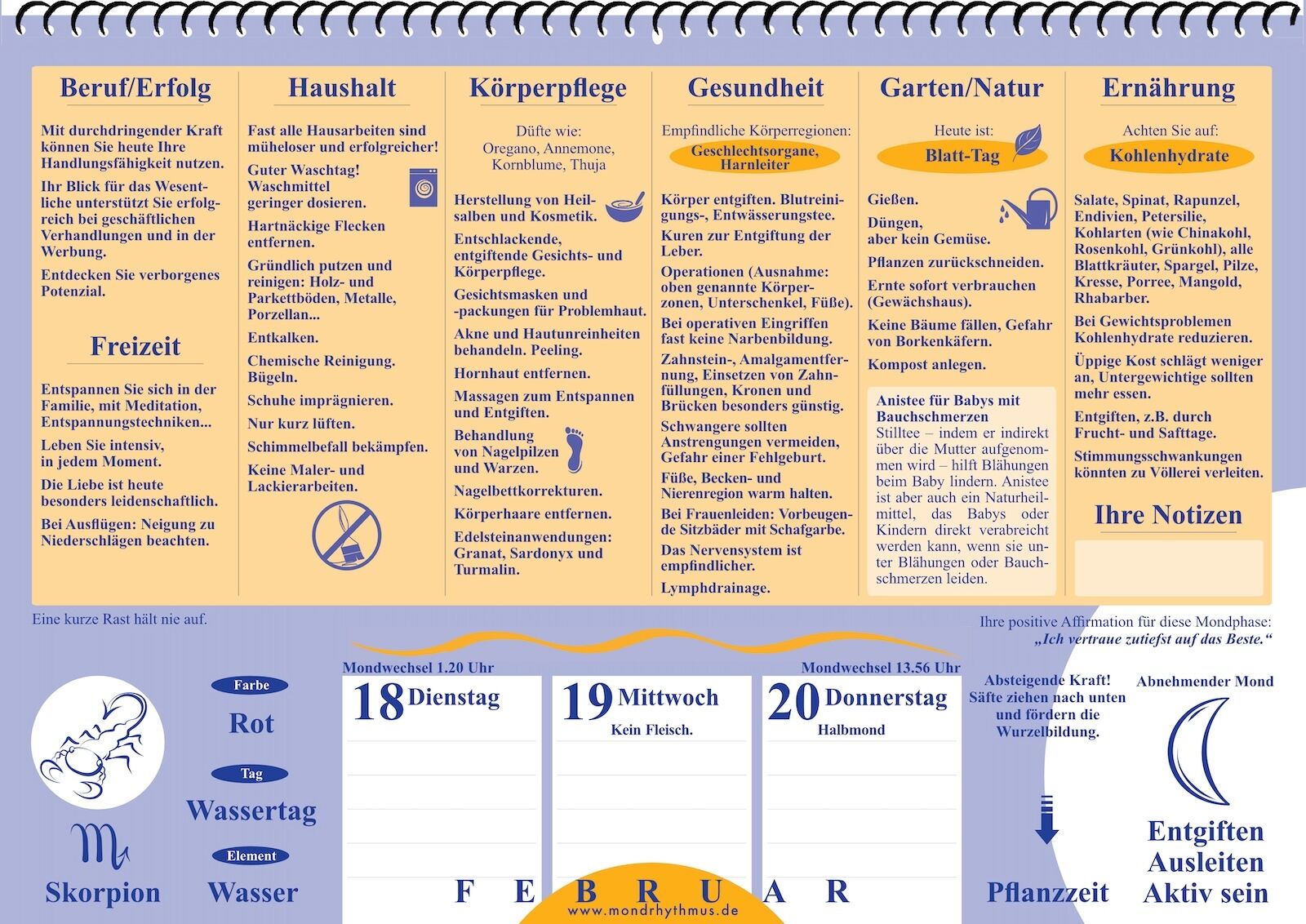 Nutzen Sie den Mondrhythmuskalender für Ihren Erfolg! Hängen Sie nützliches Wissen an die Wand. Sicher kennen Sie diese Situationen: Sie müssen eine Entscheidung treffen und sind sich nicht sicher, ob es die richtige Zeit dazu ist. Oder Sie verrichten eine rou...