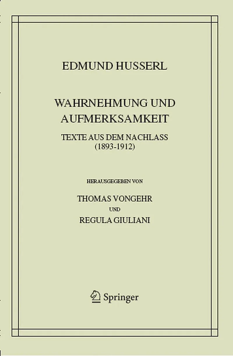 Hauptstke aus der Phomenologie und Theorie der Erkenntnis.Vorlesungen Wintersemester 1904/05.- Erstes Hauptstk. er Wahrnehmung.- Zweites Hauptstk. er Aufmerksamkeit, Spezielle Meinung.- Beilage I. Abhandlung erWahrnehmung von 1898.- Beilage II. Noten zur Lehre von Aufmerksamkeit und Interesse.- Beilage III (zu . Mittelbare und unmittelbare Auffassung des Gegenstandes Mittelbare und unmittelbare Auffassung.- Beilage IV (zu . IdentitsbewusstseinundSinn.- Beilage V (zu . Implicite wahrgenommen, mitgemeint.- Beilage VI (zu und ). Einheit und Vielheit in der Wahrnehmung.- Beilage VII (zu ). Unreine Prentation und der Begriff der Erscheinung.- Beilage VIII (zu ). Normale und anomale Wahrnehmungen.- Beilage IX (2zu). Maximalpunkte der Wahrnehmung.- Beilage X (zu ). Die Erscheinung des realen Dinges.- Beilage XI (zu ). Mittelbare und unmittelbare Identifizierung.- Beilage XII (zu ). Einheit - Identit.Mehrheit und Unterschiedenheit.Allheit.- Beilage XIII. Literaturangaben zum Thema Aufmerksamkeit.- Das Perzeptionale.- Entwurf zu einem Inhaltsverzeichnis (zu Text Nr. 2).- Wesentliche Punkte f die Herausarbeitung der Begriffe 20 "Erscheinung", "Meinung","Bedeutung" ("Aufmerksamkeit")s.- Extrakt(InhaltsangabevonBeilageXV).- Wichtige Nota zur Lehre von der Attention. AttentionaleWandlungen in der Erinnerung.- Meinen als Richtung auf den einheitlichen Gegenstand und attentionale Modifikationen sowie wechselnd.- Spezifisches Meinen als Aufmerken und synthetisches Meinen.- Beziehung der Vorstellungen auf individuelle Gegenstde.- Sinn als perzeptionale Einheit und thematisches Meinen.- Ausarbeitungen zur Schrift "er Wahrnehmung".- Richtungen der Aufmerksamkeit.- Die Schich tenderCharaktere.