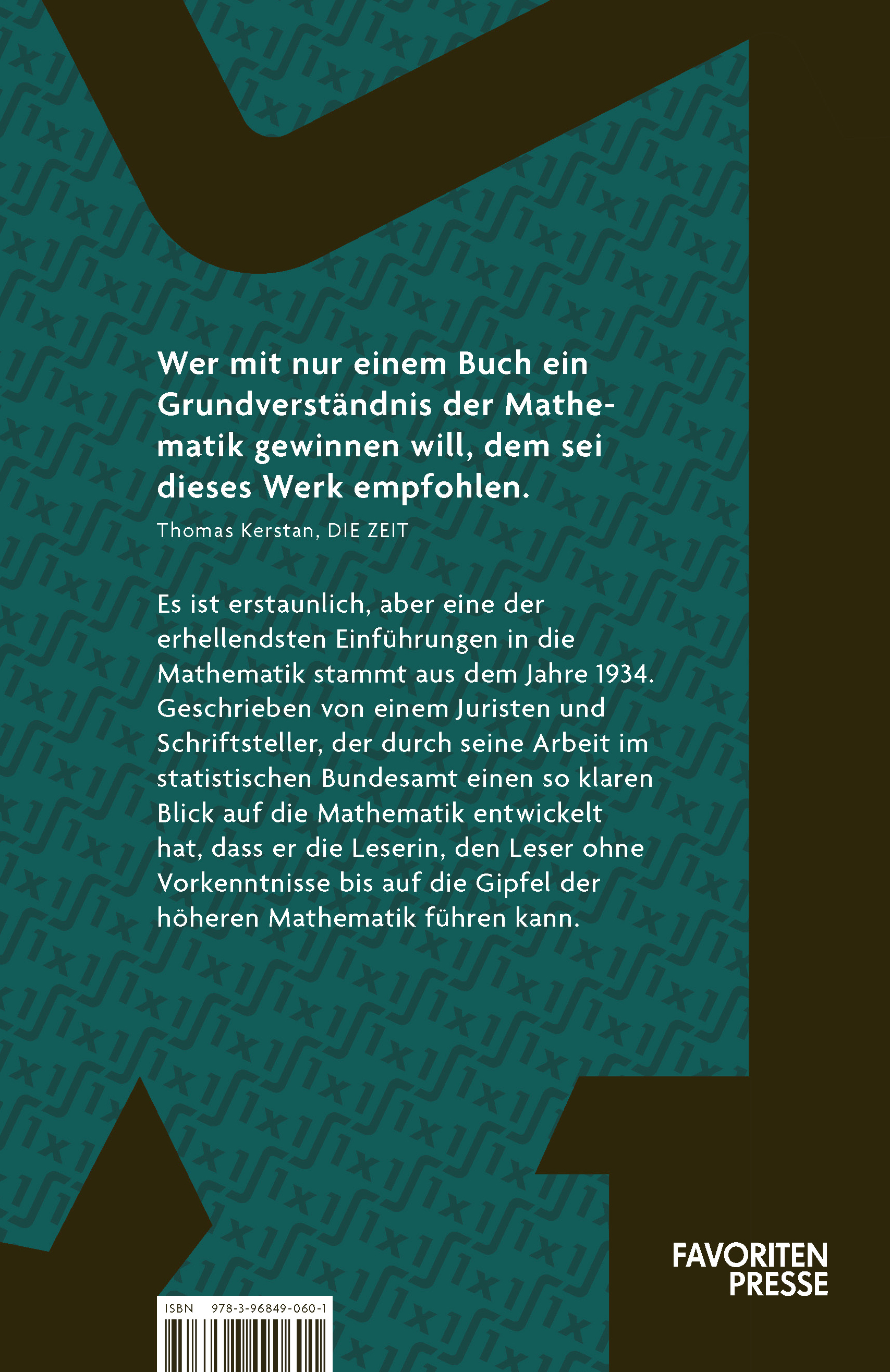 Wer mit nur einem Buch ein Grundverständnis der Mathematik gewinnen will, dem sei dieses Werk empfohlen. Es ist erstaunlich, aber eine der erhellendsten Einführungen in die Mathematik stammt aus dem Jahre 1934. Geschrieben von einem Juristen und Schriftsteller...