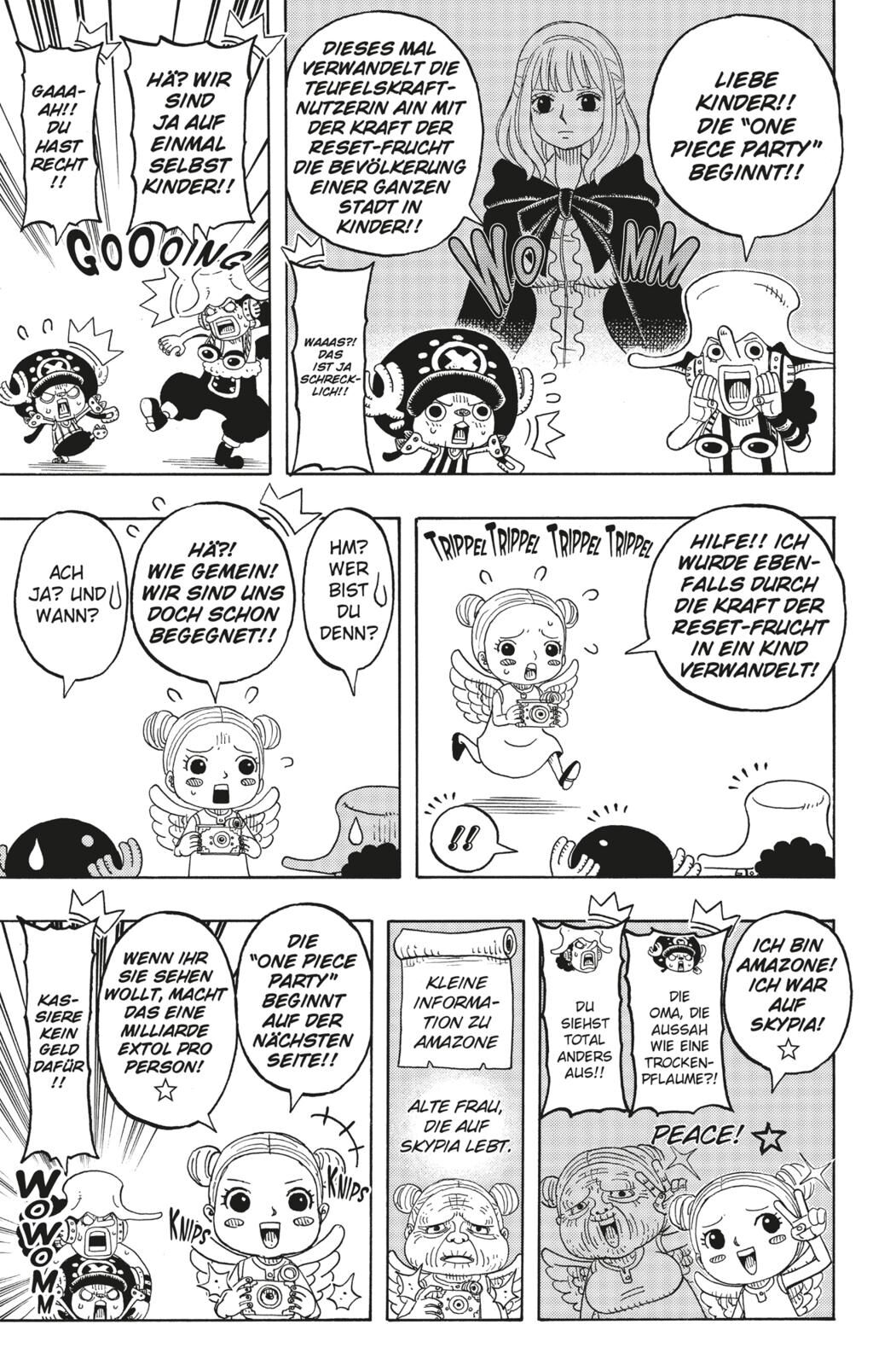 Piratenstarker Partyspaß! Willkommen bei der One Piece Party! In fünf kurzen und lustigen Kapiteln mit Gastauftritten beliebter Charaktere erleben die Strohhut-Piraten fantastische Abenteuer. Party all the time! Dieses Mal werden Ruffy und seine Freunde mit d...