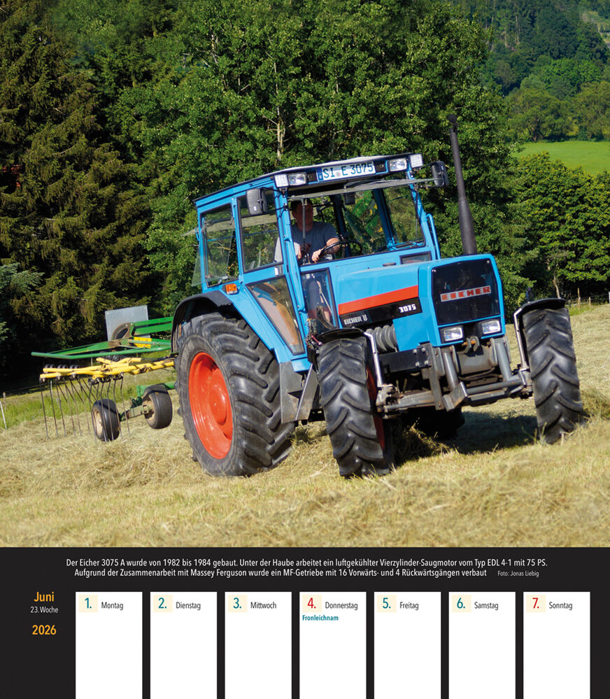 Woche für Woche gibt es eine faszinierende Abbildung eines Eicher Traktors im Einsatz in der Landwirtschaft. Das Kalendarium bietet Platz für eigene Eintragungen. Der Kalender, zum Hängen und Aufstellen, ist mit Ringbindung und einer starken Rückenpappe ausges...