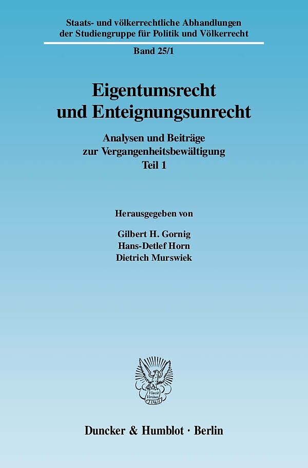 Inhalt: G. H. Gornig, Eigentum und Enteignung im Völkerrecht unter besonderer Berücksichtigung von Vertriebenen - Abstract - H.-D. Horn, Der Eigentumsschutz des Grundgesetzes im völker- und europarechtlichen Kontext der Wiedergutmachung vor-rechtsstaatlichen Unrechts - Abstract - K. Koopmann-Aleksin, Der Schutz des Eigentums als Menschenrecht - Abstract - M. Silagi, Zur Eigentumsproblematik staatlicher und nicht-staatlicher Archive insbesondere nach dem Zweiten Weltkrieg - Abstract - A. Szczeponek, Enteignung der Deutschen durch Polen nach dem Zweiten Weltkrieg aus polnischer und völkerrechtlicher Sicht - Abstract - A. Salenko, Zu den Enteignungen durch die Sowjetunion im Kaliningrader Gebiet am Ende des Zweiten Weltkriegs - Abstract - K. Klíma, Die verfassungsrechtliche Natur der Dekrete des Präsidenten der Tschechoslowakischen Republik - Abstract - M. Kralji, Die Entschädigung der deutschen Vertriebenen durch den slowenischen Staat - Abstract - J. Zeller, Das Entschädigungsgesetz Ungarns unter besonderer Berücksichtigung der Donauschwaben - Abstract - D. C. Oancea, Gesetzliche Vorschriften in Rumänien nach 1989 über die Entschädigung Enteigneter unter besonderer Berücksichtigung der nationalen Minderheiten - Abstract - Table of Contents: G. H. Gornig, Property and Expropriation in International Law with special Consideration of the Refugees - Abstract - H.-D. Horn, The Constitutional Protection of Property in the Context of the Compensation of Former Unlawful Expropriations. Aspects of International Public and European Law - Abstract - K. Koopmann-Aleksin, The Protection of Property as a Human Right - Abstract - M. Silagi, The Property of National and Non-Governmental Archives after the Second World War - Abstract - A. Szczeponek, The Expropriation of the Germans by Poland after the Second World War from a Polish and International-Law Point of View - Abstract - A. Salenko, On the Expropriations by the Soviet Union in the Kaliningrad Area at the End of the Second World War - Abstract - K. Klíma, The Constitutional Nature of the Decrees of the President of the Czechoslovakian Republic - Abstract - M. Kralji, The Compensation of the German Refugees by the Slovenian State - Abstract - J. Zeller, The Compensation Law of Hungary with Special Consideration of the Danube Svabs - Abstract - D. C. Oancea, Romanian Laws after 1989 on the Compensation of Expropriations, with Special Consideration of the National Minorities - Abstract