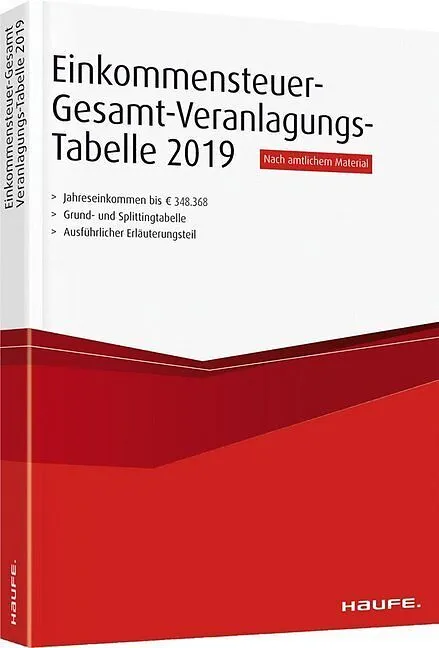 Mit der Einkommensteuer-Gesamt-Veranlagungs-Tabelle 2019 haben Sie Einkommensteuer, Solidaritätszuschlag und Kirchensteuer auf einen Blick parat. Sowohl nach der Grund- als auch nach der Splittingtabelle. Mit zahlreichen Beispielen und den aktuellen Rechtsände...