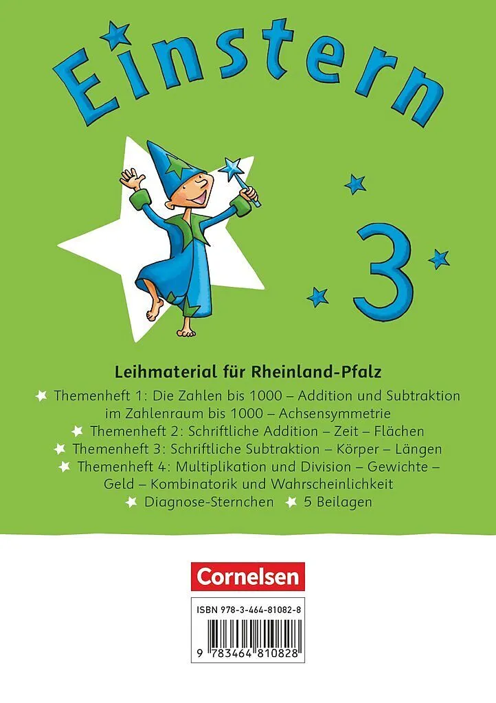 Selbstständiges Lernen im eigenen Tempo Mit dem Themenheft-Paket von Einstern begleiten Sie die Kinder sicher, strukturiert und kindgerecht durch das Schuljahr und zu einem grundlegenden Mathematikverständnis. Einstern verbindet auf liebevoll motivierende Weise gemeinsame Lernerlebnisse und individuelles Üben, unter Berücksichtigung der heterogenen Voraussetzungen und Bedürfnisse der Schülerinnen und Schüler. Das Paket enthält: Themenheft 1: Die Zahlen bis 1000, Addition und Subtraktion im Zahlenraum bis 1000, AchsensymmetrieThemenheft 2: Schriftliche Addition, Zeit, FlächenThemenheft 3: Schriftliche Subtraktion, Körper, LängenThemenheft 4: Multiplikation und Division, Gewichte, Geld, Kombinatorik und WahrscheinlichkeitDiagnose-Sternchen: Begleitheft zur LernstandsermittlungKartonbeilagen und Schuber Das zeichnet die Themenhefte aus: Überschaubare Lernportionen erleichtern die Orientierung und motivieren für den Lernstoff.Klar strukturierte, bedürfnisorientierte und selbsterklärende Aufgaben ermöglichen kindzentrierte offene Unterricht- und Lernformen.Voneinander und miteinander lernen: Anregungen für gemeinsames Handeln und BesprecheDas übersichtliche Differenzierungssystem mit Pflicht- und Wahlseiten unterstützt individuelles Fördern und Fordern.Ausgewiesenes Merkwissen für besonders relevante Inhalte helfen den Kindern beim Verstehen und Lernen.Sprachförderung und Medienbildung: Integrierte, deutlich gekennzeichnete Aufgaben helfen beim Ausbau der Sprach- und Medienkompetenz.