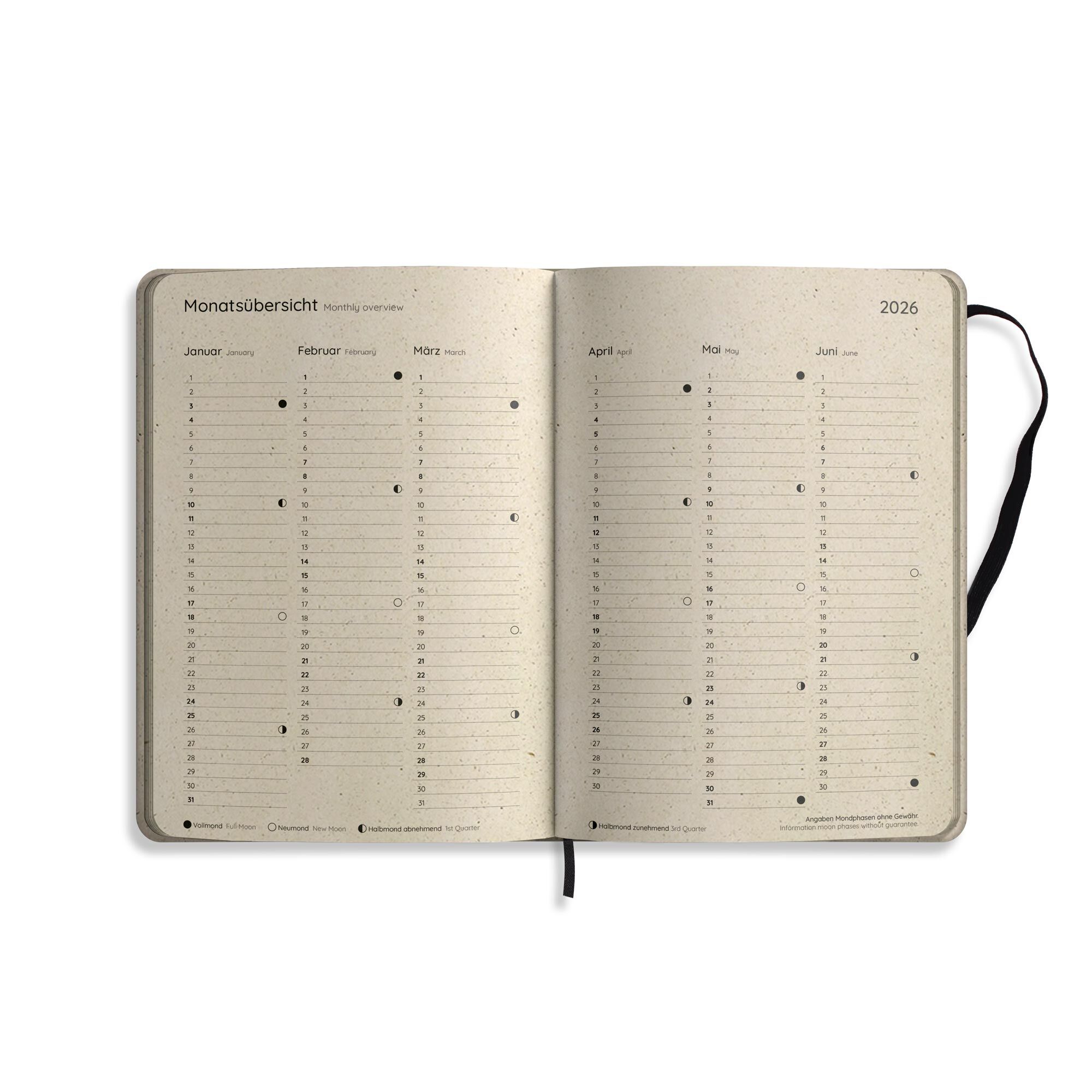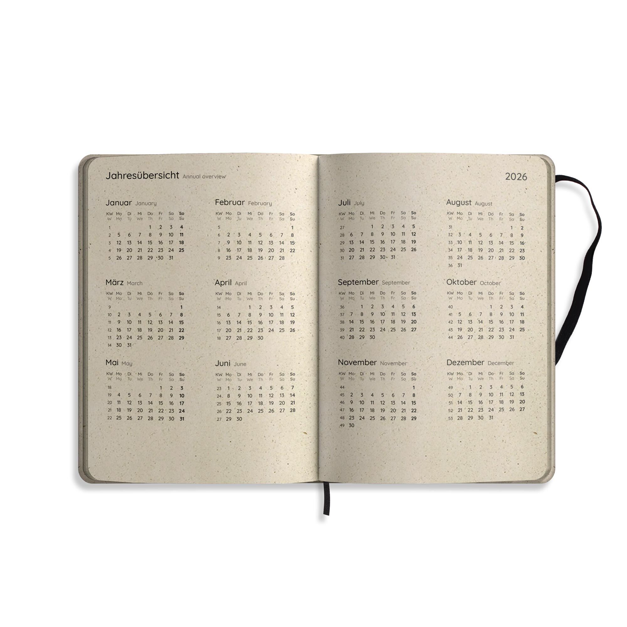 Illustriert von Lana Elanor "Samaya" bedeutet "Zeit" in Sanskrit. Mit unseren Jahresplanern wünschen wir dir genau das: Zeit für persönliche Termine, Pläne und Träume für deine Liebsten oder dich selbst. Die ersten V-Label-zertifizierten Bücher Deutschlands! Dieser nachhaltige A5 Kalender 2026 ist zweisprachig (Deutsch/Englisch) und duftet wunderbar nach Gras. So trägst du die besondere Atmosphäre, Schönheit und Ruhe einer Sommerwiese immer bei dir! Der Samaya in der Farbe: Ocean Blue überzeugt mit seinem wunderschön maritimen Aquarell Design und einer klar strukturierten Wochenübersicht: Eine Kalenderwoche auf einer Doppelseite sowie viel Platz für Notizen oder um selbst kreativ zu werden. Darüber hinaus ist er mit Feiertagen für Deutschland sowie internationalen Feiertagen ausgestattet. Die praktische Jahresübersicht zeigt das laufende Jahr und erleichtert langfristige Planung. Eine Monatsübersicht inklusive Mondphasen hilft dir, Termine auf einen Blick zu erfassen. Auch die Schulferien für Deutschland, Österreich und die Schweiz sind aufgeführt und ermöglichen so eine verlässliche Planung in schulischen und familienbezogenen Kontexten. Mit sanften Aquarellillustrationen zu jedem Monatsanfang lädt der Wal-Kalender dazu ein mit den anmutigen und eleganten Meeresriesen in den endlosen Ozean einzutauchen und sorgt für Entschleunigung im Alltag. Lass dich gemeinsam mit Tipps von PETA Deutschland e.V. dazu begeistern, unsere blaue Lunge mit ihren majestätischen Meeresbewohnern zu erhalten. Mit jedem verkauften Exemplar unterstützt ein Teil des Erlöses die landesweit größte Tierschutzorganisation. Verwendbar als umweltfreundlicher Jahresplaner, Jahreskalender, Kalender, Familienkalender, Notizbuch, Tagebuch, Terminplaner, Achtsamkeitstagebuch, Bullet Journal, Reisetagebuch, Dankbarkeitstagebuch, Hausaufgabenheft, Uni-Planer, Taschenkalender, Buchkalender, Business-Planer, Walkalender, Haikalender, Meerkalender, maritimer Kalender, Ozeankalender, Orcakalender, Tierkalender oder Wochenplaner. Perfekt geeignet als nachhaltiges Geschenk für dich und deine Liebsten. Unsere Papiere sorgen für ein außergewöhnliches Schreibgefühl und lassen sich mit unterschiedlichsten Stiften und Farben beschreiben. Dank seiner natürlichen Robustheit franst Tinte nicht aus und blutet auch nicht auf der Rückseite durch. Ein kurzes Antrocknen lassen sorgt dafür, dass nichts verwischt. Angaben zum Inhalt Übersicht Schulferien (D, AT, CH) Jahresübersicht (2026/2027) Monatsübersicht (2026) inkl. Mondphasen Voll illustriert mit 12 gestalteten Monatsauftaktseiten Wochenübersicht Basic (Kalenderwoche auf einer Doppelseite + Platz für Notizen) Die Wochenübersicht beinhaltet Feiertage (DE + International) Platz für Notizen und Skizzen (5 Seiten) Technische Angaben Format A5 Hardcover mit runden Ecken aus Graspapier (bis zu 50 % Grasfaseranteil, Frischfaseranteil aus FSC-zertifizierten Wäldern) 152 Seiten (inkl. Vor- und Nachsatz) aus 90 g/m² Graspapier Fadenheftung Öko-Druckfarben Mit dem V-Label als vegan ausgezeichnet OEKO-TEX®-zertifiziertes Lesezeichen und Gummiband Froschtasche Nicht die passende Wochenaufteilung oder das richtige Format für dich und deinen Alltag? Dann schau dir gern auch unsere anderen Kalender an. Neben den zahlreichen Designs gibt es verschiedene Aufteilungen, um für jeden individuellen Tagesablauf den passenden Jahresplaner zu bieten. matabooks - Made with in Germany