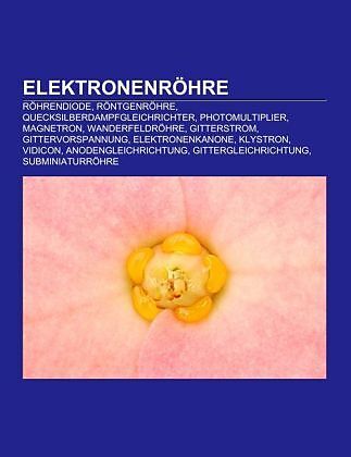 Quelle: Wikipedia. Seiten: 96. Kapitel: Röhrendiode, Röntgenröhre, Quecksilberdampfgleichrichter, Photomultiplier, Magnetron, Wanderfeldröhre, Gitterstrom, Gittervorspannung, Elektronenkanone, Klystron, Vidicon, Anodengleichrichtung, Gittergleichrichtung, Subm...Quelle: Wikipedia. Seiten: 96. Kapitel: Röhrendiode, Röntgenröhre, Quecksilberdampfgleichrichter, Photomultiplier, Magnetron, Wanderfeldröhre, Gitterstrom, Gittervorspannung, Elektronenkanone, Klystron, Vidicon, Anodengleichrichtung, Gittergleichrichtung, Subminiaturröhre, Bildaufnahmeröhre, Sekundärelektronenvervielfacher, Steuergitter, Amplitron, Barkhausensche Röhrenformel, Stahlröhre, Thyratron, Mikrofonie, Photozelle, Barkhausen-Kurz-Schwingung, EL34, Spanngitterröhren, Bildverstärker, Kathodenstrahlen, Elektrometerröhre, RV12P2000, Ikonoskop, ECC83, Trigatron, Anodenbatterie, Scheibentriode, Ionenfleck, Ballasttriode, Nuvistor, Laufzeitröhre, Kanalelektronenvervielfacher, Batterieröhre, EF86, EL84, Anlaufstromgesetz, Niederspannungsröhre, 6L6, Glimmstabilisator, Kathodenfolger, ECC86, Williamsröhre, Kathodolumineszenzmikroskop, Inductive Output Tube, Anodenverlustleistung, Schirmgitter, Nullode, Krytron, Ignitron, Lenard-Fenster, New Old Stock, Excitron, Abklopfhammer, 6SN7, Photokathode, Karbonisieren, Schottky-Gleichung, Durchgriff, Potenzialspeicherröhre, EF83, Kathodengleichrichtung, KT88, Wehneltzylinder, 6N2P, 6N23P, Tungar, Gittersteuerung, 6550, Entbrummer, Elektronenstoßröhre, Senditron. Auszug: Eine Elektronenröhre ist ein elektronisches Bauelement, das aus einem evakuierten oder gasgefüllten Kolben aus Glas, Stahl oder Keramik besteht, in den mehrere Elektroden, mindestens eine beheizte Kathode und eine Anode, eingelassen und von außen kontaktiert sind. Sie dient zur Gleichrichtung, Erzeugung, Verstärkung oder zur Modulation von elektrischen Signalen. Radioröhren: ECC85, EL84 und EABC80 Eine Auswahl an Elektronenröhren Die Rimlockpentode EF42 6L6GC-Röhren: links General Electric zirka 1960, rechts Svetlana Electron Devices, Russland zirka 2000Im Inneren der Röhre treten Elektronen aus einer Glühkathode als freie Elektronen aus (Elektronenemission) und fliegen unter dem Einfluss eines elektrischen Feldes zu einer Anode. Durch ein Steuergitter zwischen Kathode und Anode lässt sich der Strom beeinflussen, denn durch unterschiedliche Gitterspannungen bzw. elektrische Felder kann der Elektronenfluss gehemmt oder verstärkt werden. Darauf beruht die Verwendung der Elektronenröhre als Verstärkerröhre oder Oszillator. Elektronenröhren waren bis zur Einführung des Transistors die einzigen schnellen aktiven (steuerbaren) Bauelemente der Elektronik. Bis dahin standen als aktiver Vierpol lediglich Magnetverstärker und Relais zur Verfügung; wobei letztere nur zwei Zustände (ein/aus) kannten und deren Schaltgeschwindigkeit durch die bewegte Masse begrenzt war. Elektronen weisen eine weitaus geringere Masse auf, daher können mit ihrer Hilfe weitaus höhere Frequenzen verarbeitet werden. Je nach Röhrentyp ist ein Gas niedrigen Drucks enthalten, das eine zusätzliche Ionenleitung bewirkt und die Wirkung der Raumladung kompensiert. Auch heute sind in vielen Gebieten noch Röhren im Einsatz. Starke Sendeanlagen werden mit Elektronenröhren betrieben, Magnetrons werden in Radaranlagen und Mikrowellengeräten eingesetzt. Ältere Fernsehgeräte und Computermonitore verwenden eine Kathodenstrahlröhre. Hi-Fi-Verstärker werden mit ihnen bestückt und betrieben. Auch viele E-Gitarristen sc