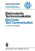 Inhalt/Contents.- Die Einführung neuer Formen der Textkommunikation durch die Deutsche Bundespost.- of New Forms of Text Communication by the Deutsche Bundespost.- Videotext-Systeme heute und morgen - Stand der Technik und Anwendungsmöglichkeiten.- Broadcast Teletext Systems today and tomorrow-Engineering Approaches and Possible Applications.- Services Offered by the Interworking between Videotex and Facsimile.- Dienste, die auf der Zusammenarbeit von Videotex und Faksimile basieren.- Elektronische Vertriebswege für die Presse.- Electronic Ways of Distribution for the Press.- Feldversuche mit Videotext-Systemen in der Schweiz.- Field Trials with Videotext Systems in Switzerland.- Kabeltext und Kabeltextabruf.- Cable Text and Cable Text Retrieval.- Bildschirmtext Nutzungsfragen aus der Sicht technischer Gestaltungsüberlegungen.- Bildschirmtext Utilization Aspects in View of System Alternatives.- Leistungsmerkmale, Systemkonfiguration und Schaltungstechnik für Bildschirmtext-Einrichtungen.- Facilities, System Configuration and Circuit Design for Bildschirmtext.- Das Bildschirmtext-Endgerät und seine mögliche zukünftige Entwicklung.- The Bildschirmtext Terminal and its Possible Future Development.- An Intelligent Home Information Terminal.- Ein intelligentes Heimterminal für Informationszwecke.- Nutzungsmöglichkeiten von Bildschirmtext im Versandhandel.- The Utilization of Viewdata in the Mail-Order Business.- Bildschirmtext, Compunications und Fachpresse.- Bildschirmtext, Compunications and Periodical Press.- Viewdata Applications.- Viewdata Anwendungen.- Textkommunikation im Bildungswesen.- Text Communication in Education.- Arbeitsmedizinische und ergonomische Aspekte der Bildschirmarbeit.- Working with the Viewing Screen in the Light ofIndustrial Medicine and Ergonomics.- Elektronische Fernschreiber Heutiger Stand und Entwicklungstendenzen.- Electronic Teleprinters Current Situation and Development Tendencies.- Mindestausstattung und Ausbaustufen der TELETEX-Station (Bürofernschreiber).- Minimum Equipment Requirements and Expansion Stages of the TELETEX-Terminal.- Technische Aspekte des Einsatzes von Schreibautomaten als Kommunikationsgeräte (Bürofernschreiber) aus internationaler Sicht.- Technical Aspects for the Use of Communication Typewriters from an International Viewpoint.- Schnell und lautlos drucken mit dem Tintenstrahl.- High-Speed Silent Printing with Ink Jet.- Elektrostatische Druckverfahren.- Electrostatic Printing Methods.- Continuous Speech Recognition for Text Applications.- Kontinuierliche Spracherkennung für den Einsatz bei der Textverarbeitung.- Intelligentes Terminal zur wirtschaftlichen Nutzung vorhandener Schmalbandkanäle (Aktentaschen-Computer).- Intelligent Terminal for the Economical Use of Existing Narrow-Band Channels (Brief Case Computer).- Teleboard, Scribophone and their Relation to Coded Text Transmission.- Entwurf und Anwendungsbereich von elektronischen Schreibsystemen.- Teleboard Systems.- Elektronische Schreibtafelsysteme.- A New Telewriter for Dial Network Use.- Fernzeichengerät für den Einsatz in Wählnetzen.- Displayphone: An Interactive Graphical Communication Experiment.- Displayphone: Ein interaktives graphisches Versuchssystem.- Fernkopieren, Stand in den USA.- Facsimile, Situation in the USA.- Leistungsmerkmale und Anwendung von Fernkopiergeräten.- Facilities and Applications of Telecopying Equipment.- Plasmaschreibköpfe Baugruppen für künftige Faksimiletechnik.- Plasma Recording Heads Modules for Future Facsimile Equipment.-A New Network for Nation-Wide Facsimile Communication.- Ein neues nationales Netz für Fernkopieren.- Gedanken zur Harmonisierung von visuellen Diensten in Fernmeldenetzen.- Concepts for the Harmonization of Visual Services in Telecommunication Networks.- Der Elektronische Postdienst eine Möglichkeit der künftigen Briefkommunikation.- Electronic Mail an Approach to Future Text and Document Communication.- Förderungsschwerpunkte des Bundesministeriums für Forschung und Technologie (BMFT) auf dem Gebiet der Bürokommunikation.- Concepts of the German Ministry for Research and Technology in Supporting Developments in the Field of Office Communication.- Pilotprojekt Bürokommunikation.- Pilot Project Office Communication.- Anwendungsorientierte Hard- und Software für interaktive Textbe- und -verarbeitung.- Application-Oriented Hardware and Software for Interactive Text Processing.- Das Büro der Zukunft.- The Office of the Future.- Arbeitsplatz und Kommunikation im zukünftigen Büro.- Work Desk and Communication Facilities in the Office of the Future.- Mensch und Automation im Büro.- Man and Automation in the Office.- Organisatorische und individuelle Auswirkungen der neuen Bürotechniken.- Organizational and Individual Effects of New Office Technics.