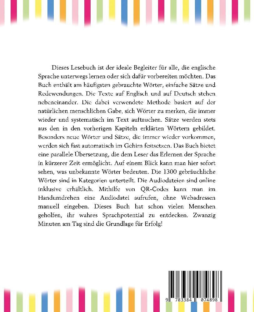 Dieses Lesebuch ist der ideale Begleiter für alle, die englische Sprache unterwegs lernen oder sich dafür vorbereiten möchten. Das Buch enthält am häufigsten gebrauchte Wörter, einfache Sätze und Redewendungen. Die Texte auf Englisch und auf Deutsch stehen neb...