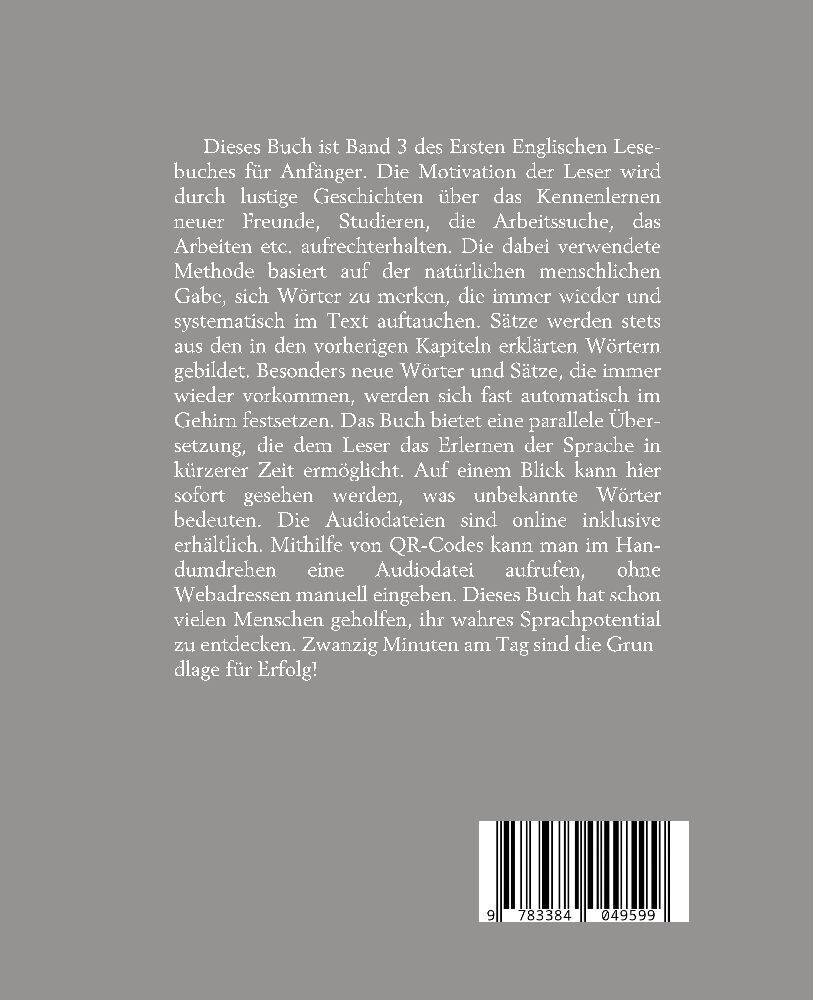 Dieses Buch ist Band 3 des Ersten Englischen Lesebuches für Anfänger. Die Motivation der Leser wird durch lustige Alltagsgeschichten über das Kennenlernen neuer Freunde, Studieren, die Arbeitssuche, das Arbeiten etc. aufrechterhalten. Die dabei verwendete Meth...