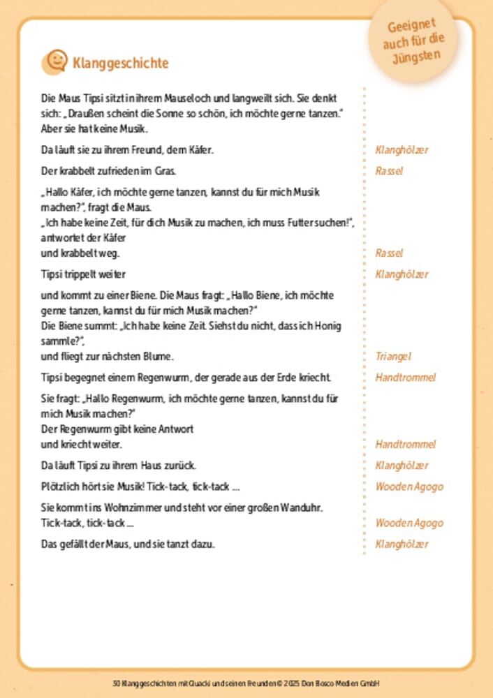 Hüpfen, quaken, Fliegen fangen: Was Quacki macht, wird in diesen Mitmachgeschichten auf Orff-Instrumenten vertont! 32 Bildkarten mit Klanggeschichten Kurze Klanggeschichten mit Tieren: Quacki, der kleine freche Frosch Quacki lebt eigentlich glücklich und zufri...