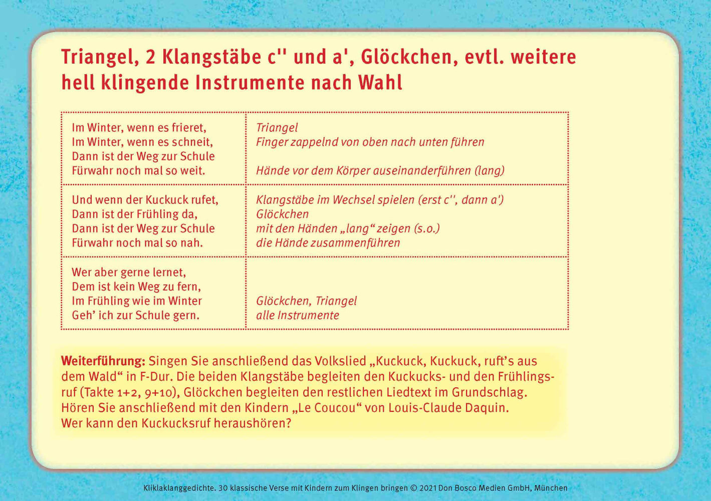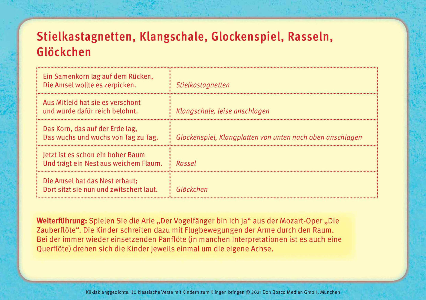 Orff-Instrumente, kurze Gedichte und klassische Musik: Elke Gulden und Bettina Scheer haben für beliebte Kindergedichte Ideen zur musikalischen Umsetzung entwickelt. Dabei steht die kindliche Begeisterung für Sprachexperimente und der Spaß an Rhythmus und Musik immer im Vordergrund. Lyrik fördert in Verbindung mit musikalischer Umsetzung Musikalität und Sprachentwicklung gleichermaßen. Zur Vertiefung stehen direkt auf den Karten Vorschläge, wie den Versen mit klassischer Musik nachgespürt werden kann, beispielsweise bei einer stillen Bastelstunde oder beim Malen. Auditive Wahrnehmung verbessern, Wortschatz erweitern und Musikempfinden steigern: Mit den KliKlaKlang-Gedichten von Don Bosco ein Kinderspiel!