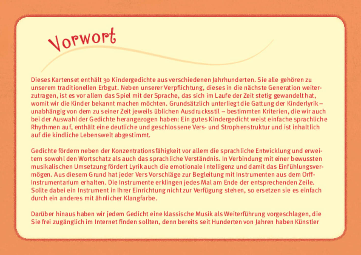 Guggenmoos und Ringelnatz, Goethe und Eichendorff: Der Reiz der Kinderlyrik aus diesem Kartenset liegt in ihrem Rhythmus! Damit werden kindliches Sprachgefühl und Musikempfinden gleichermaßen unterstützt. Alle Gedichte können leicht nachgesprochen werden und eignen sich hervorragend dazu, mit Instrumenten im Takt begleitet zu werden. Ganz nebenbei werden dabei die sprachliche Entwicklung, Feinmotorik und Konzentration der Kinder gefördert: