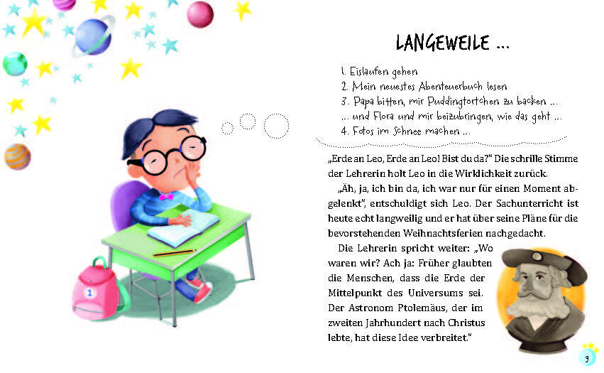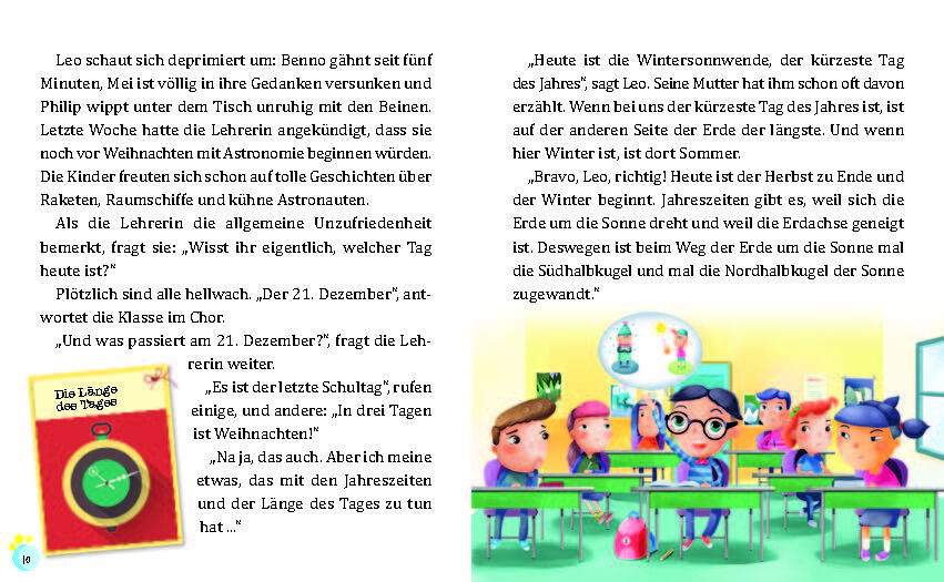 In der Schule berichtet der Lehrer kurz vor den Weihnachtsferien vom Himmel und dem Universum. In den Ferien sollen sich die Kinder darüber Gedanken machen. Leo fängt sofort Feuer und erzählt zu Hause von Sonne, Mond und Sternen. Aber was haben Sterne und Plan...
