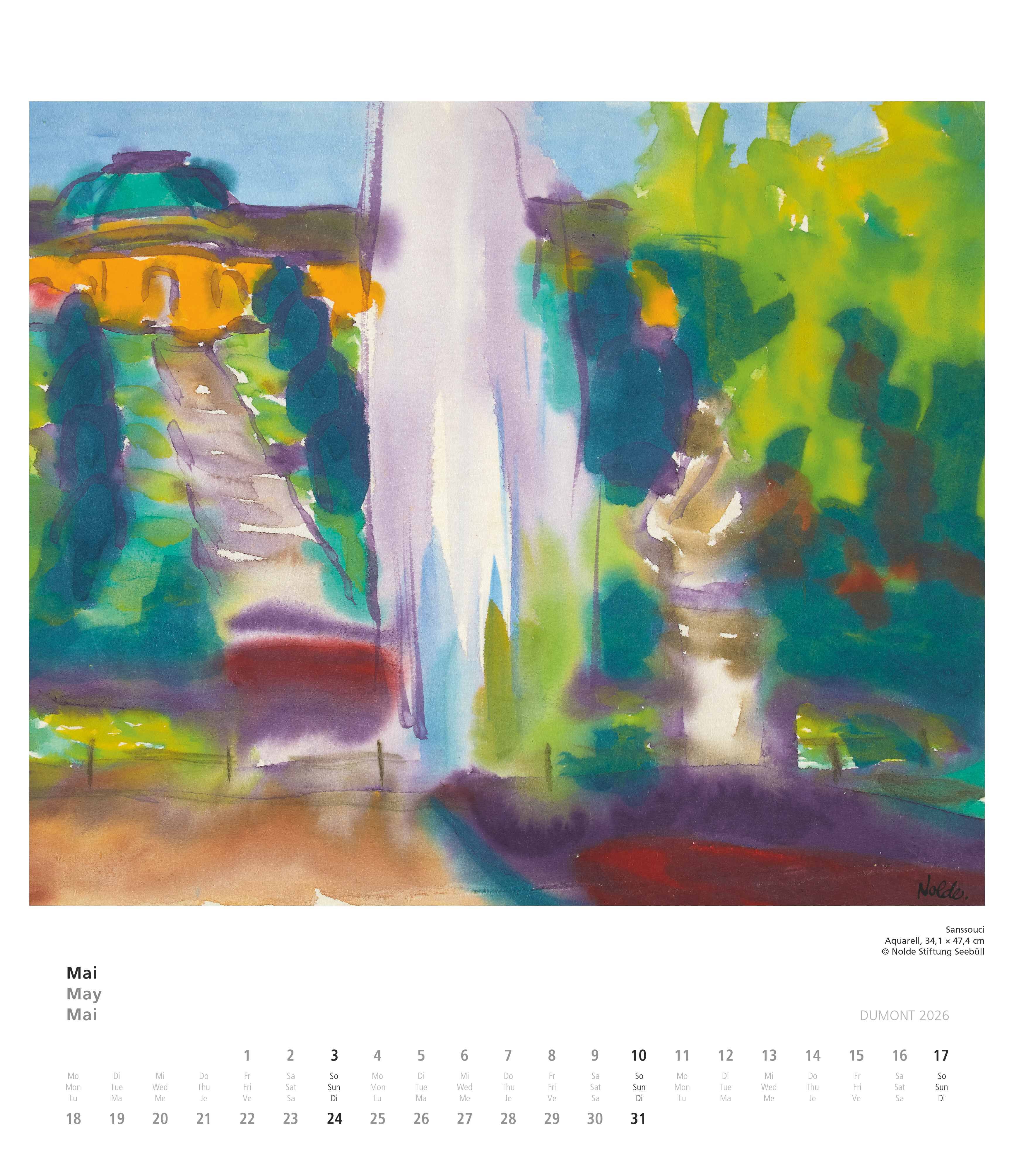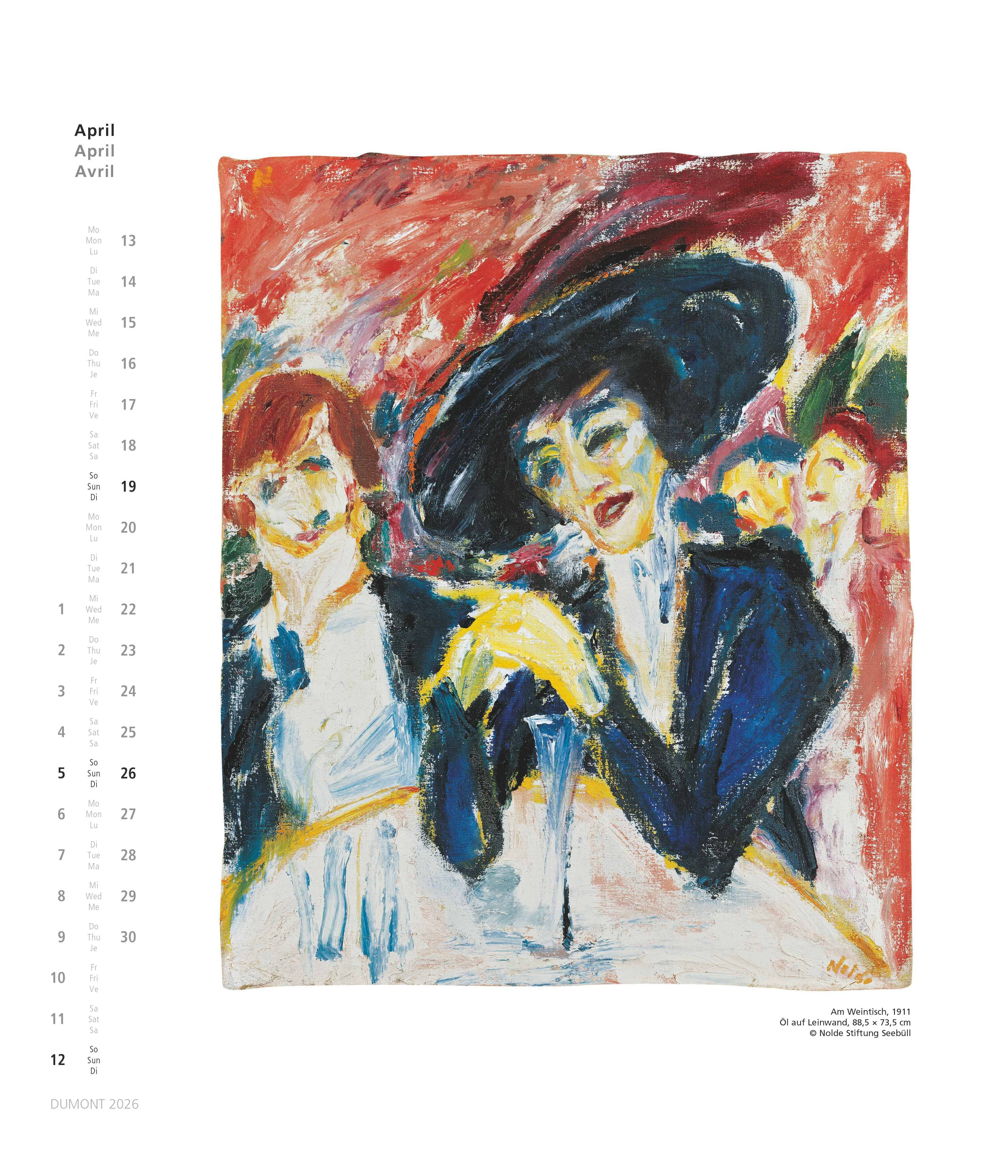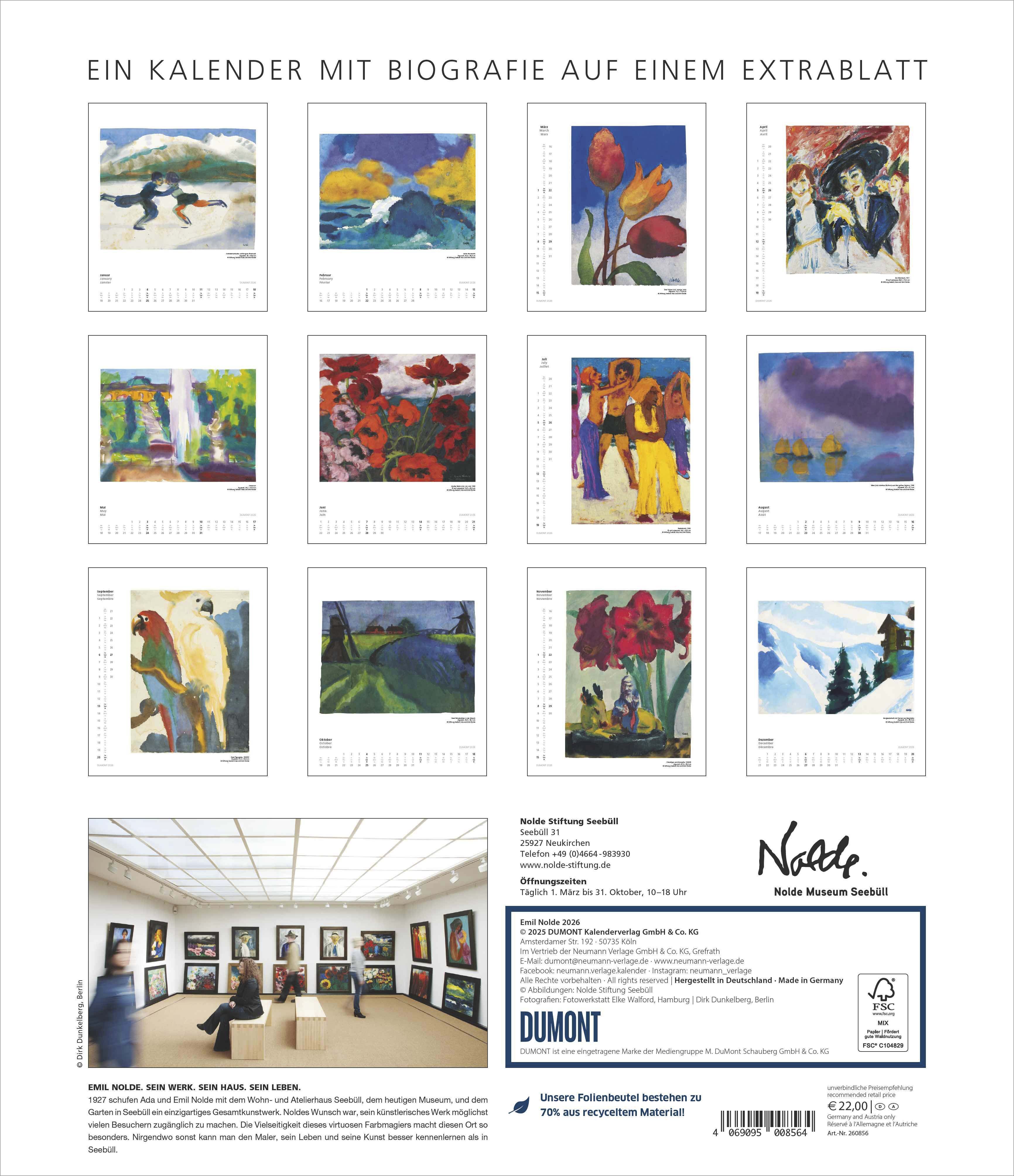 Der DUMONT Emil Nolde Kalender 2026 präsentiert zwölf herausragende Werke des großen Expressionisten, ausgewählt in Zusammenarbeit mit der Nolde Stiftung Seebüll. Blumen, Landschaften und Fantasien geben einen einzigartigen Einblick in das Schaffen Noldes. Hi...