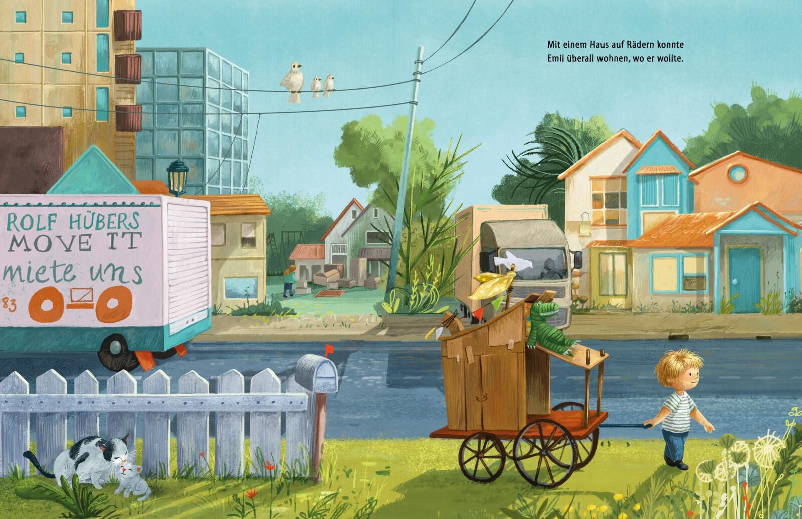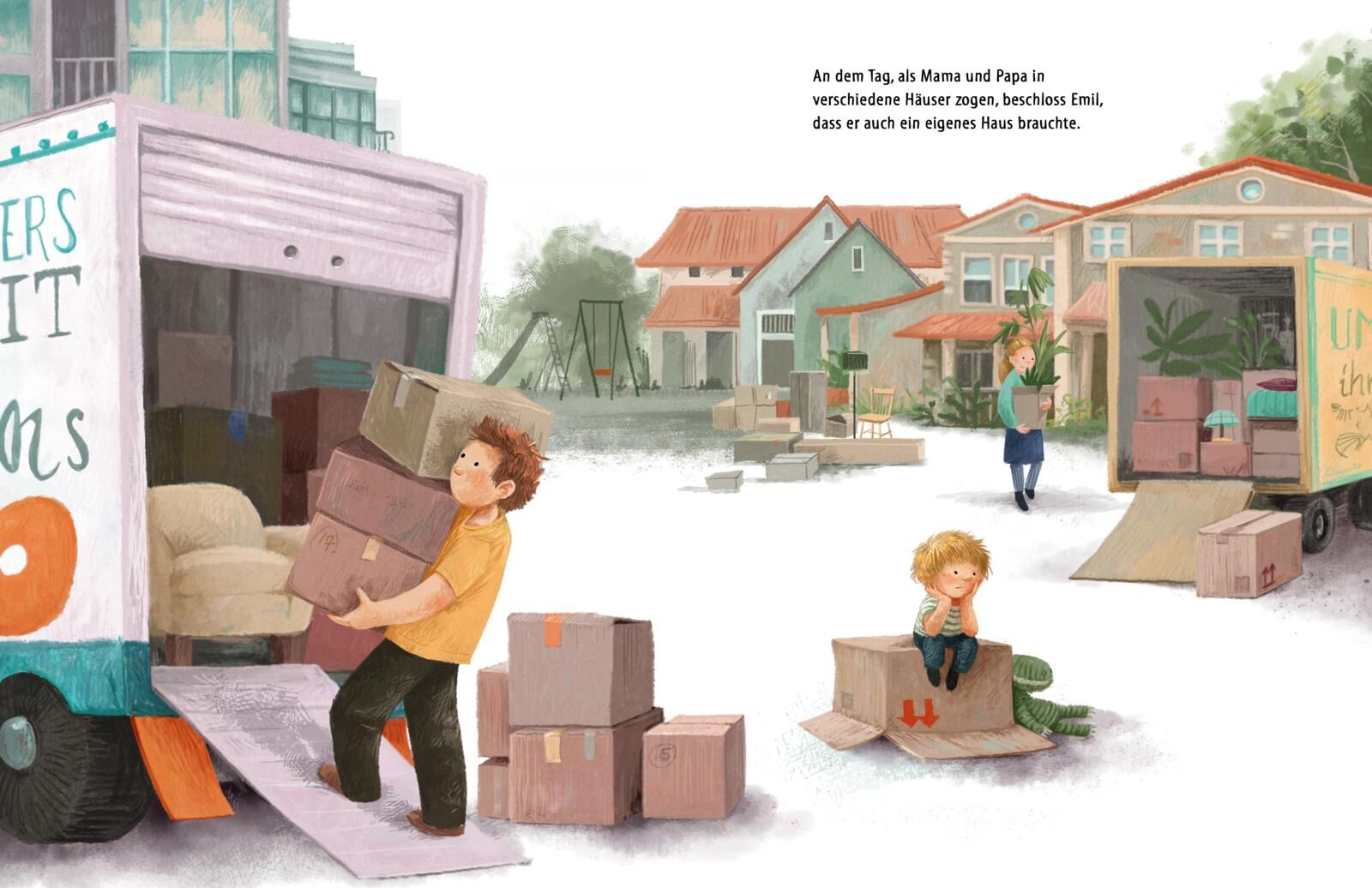 Berührendes Bilderbuch für Kinder ab 4 Jahren Als seine Eltern sich trennen und jeder in eine andere Wohnung zieht, beschließt Emil, dass er auch ein eigenes Zuhause braucht. Also baut er sich ein kleines Haus auf Rädern, mit dem er zu Mama, Papa oder sonst w...