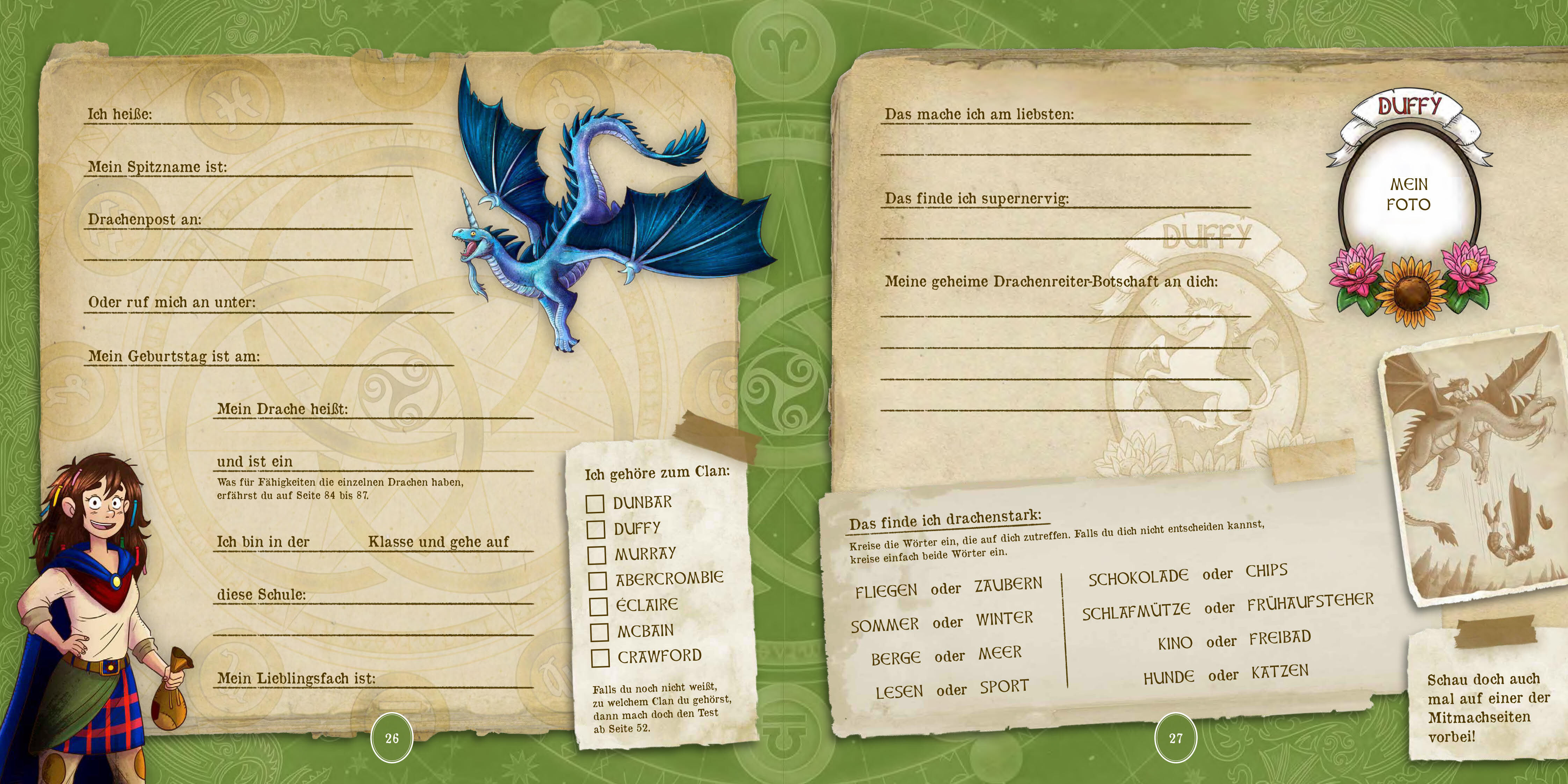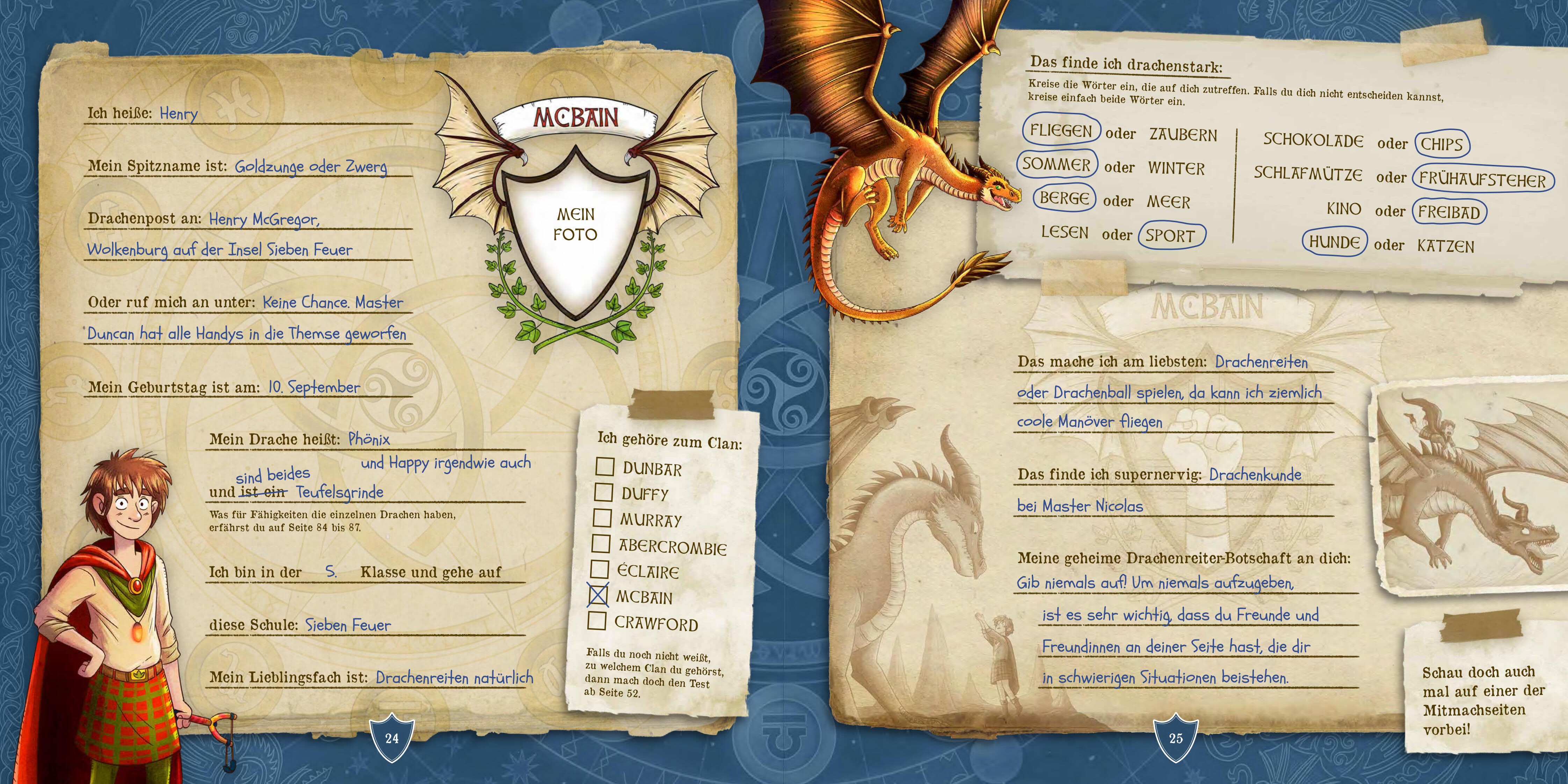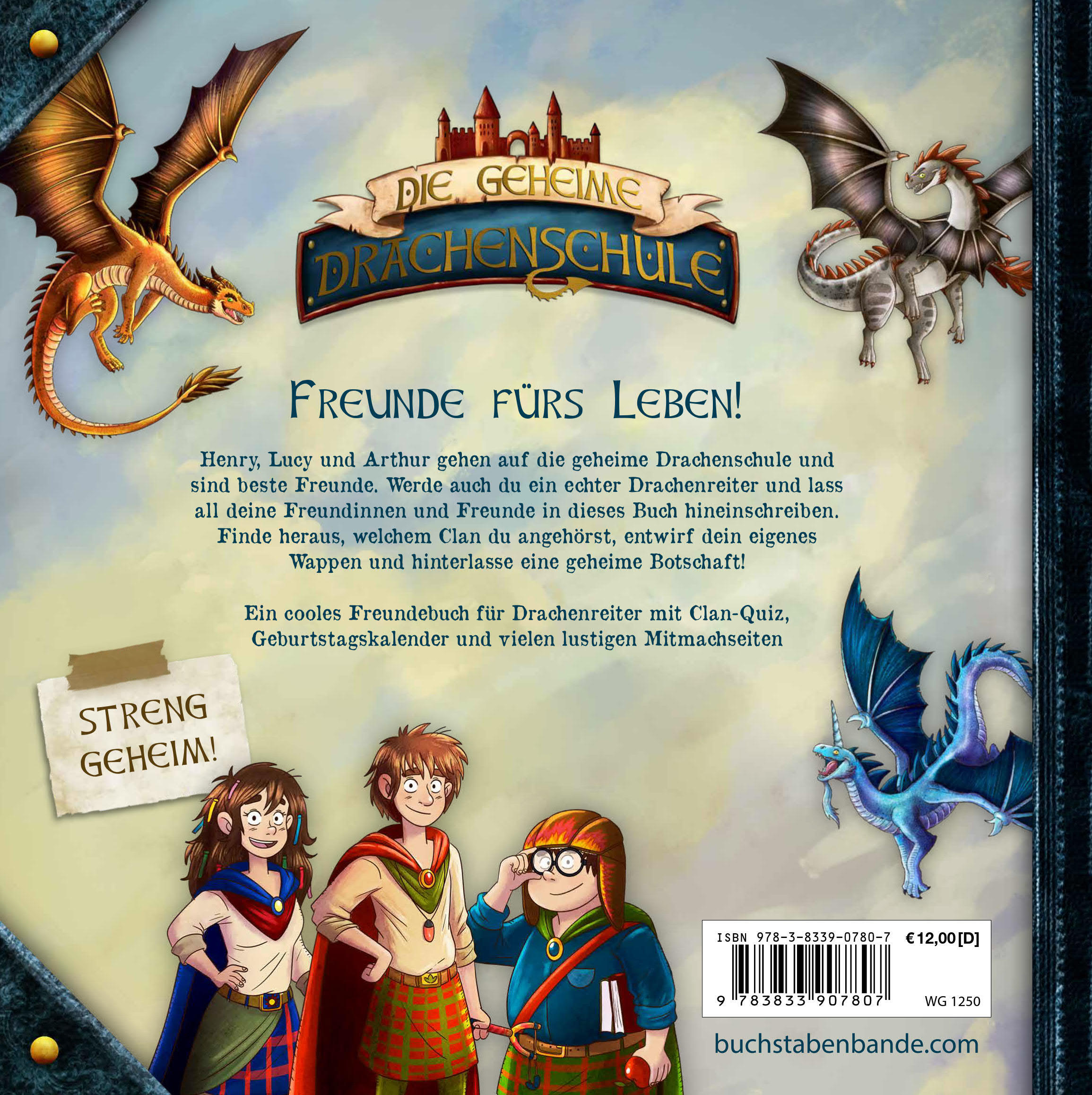 Henry, Lucy und Arthur gehen auf die geheime Drachenschule und sind beste Freunde. Werde auch du ein echter Drachenreiter und lass all deine Freundinnen und Freunde in dieses Buch hineinschreiben. Finde heraus, zu welchem Clan sie gehören, welcher ihr Lieblin...