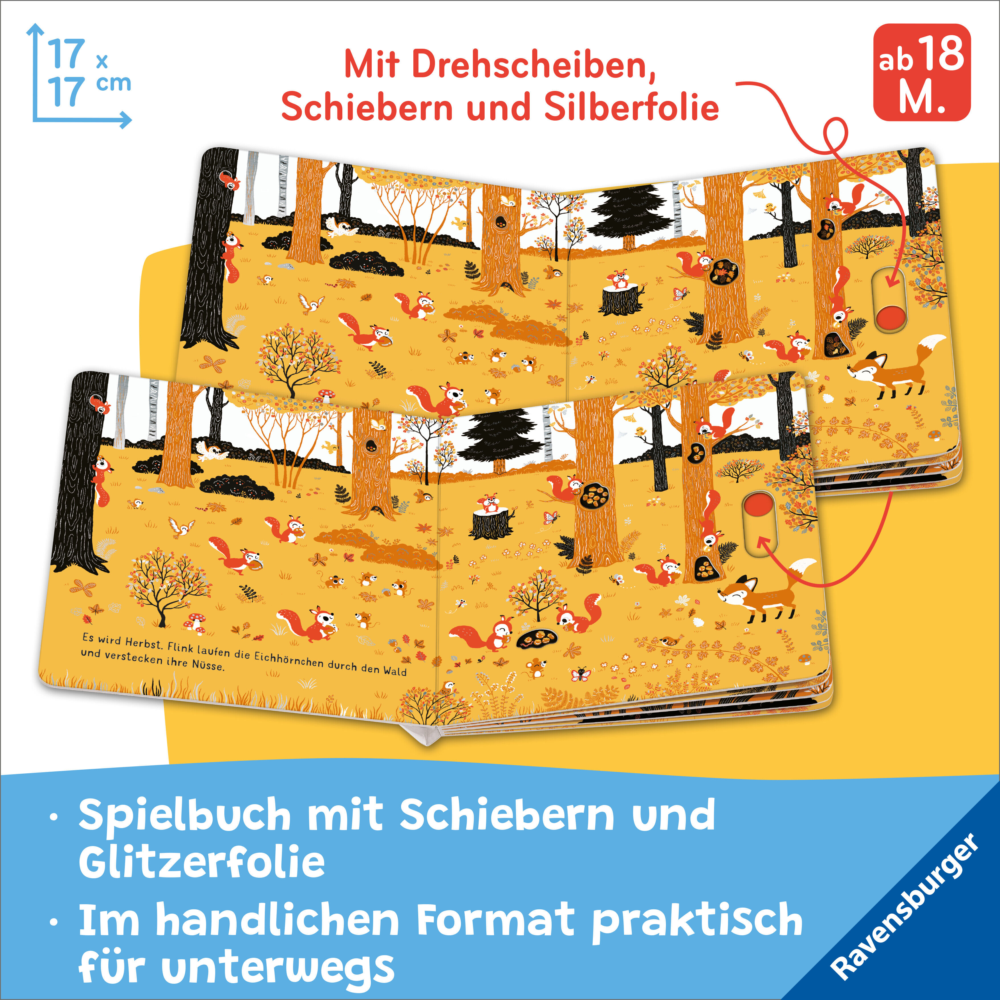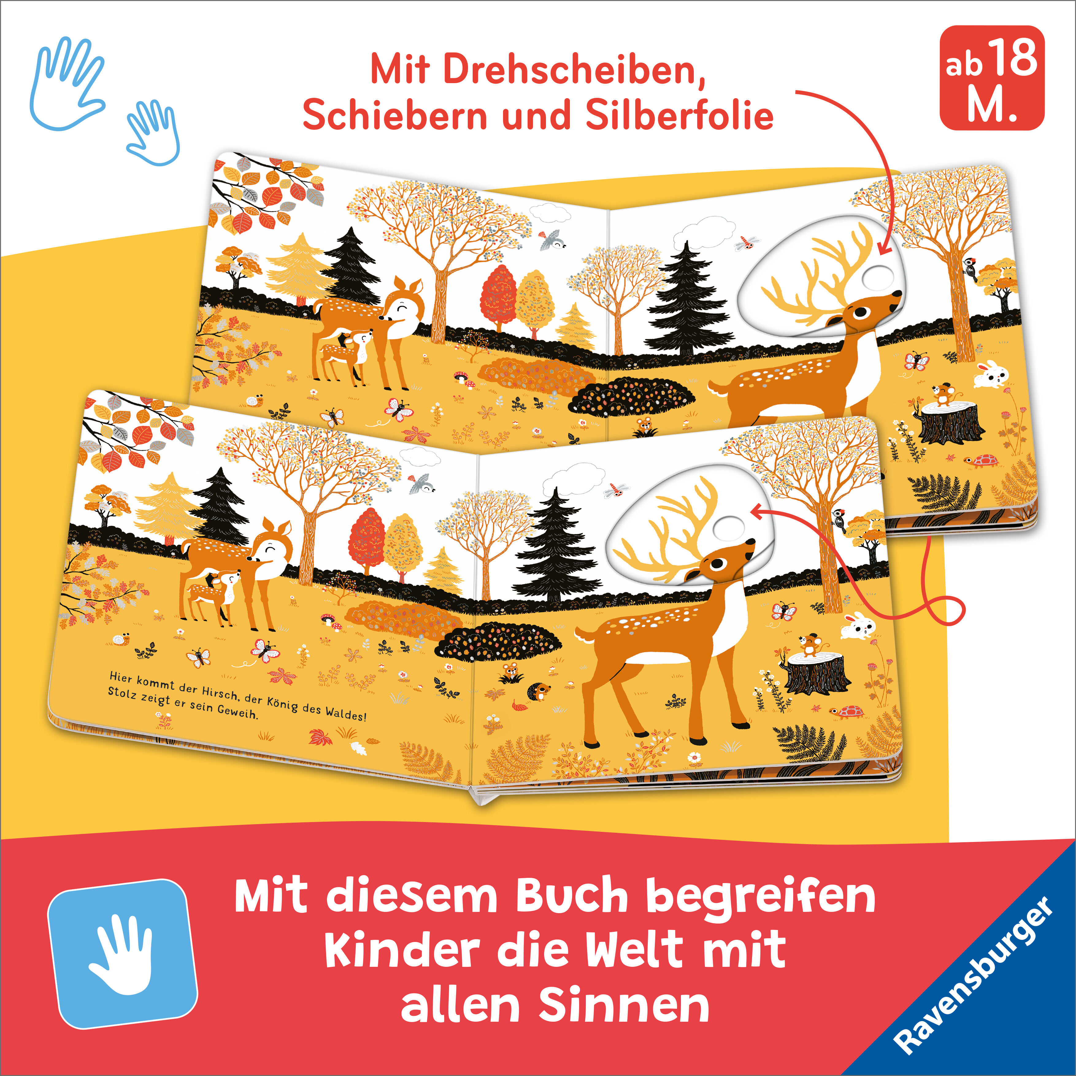 Was machen die Tiere im Wald? Es ist Herbst im Wald: Die Eichhörnchen sammeln Nüsse und verstecken sie an vielen Orten, der Hirsch ruft laut, um sein Kleines zu beschützen. Sein Ruf weckt die Wildschweine und Wiesel, die aufgeregt über die Wiese rennen. Der kl...