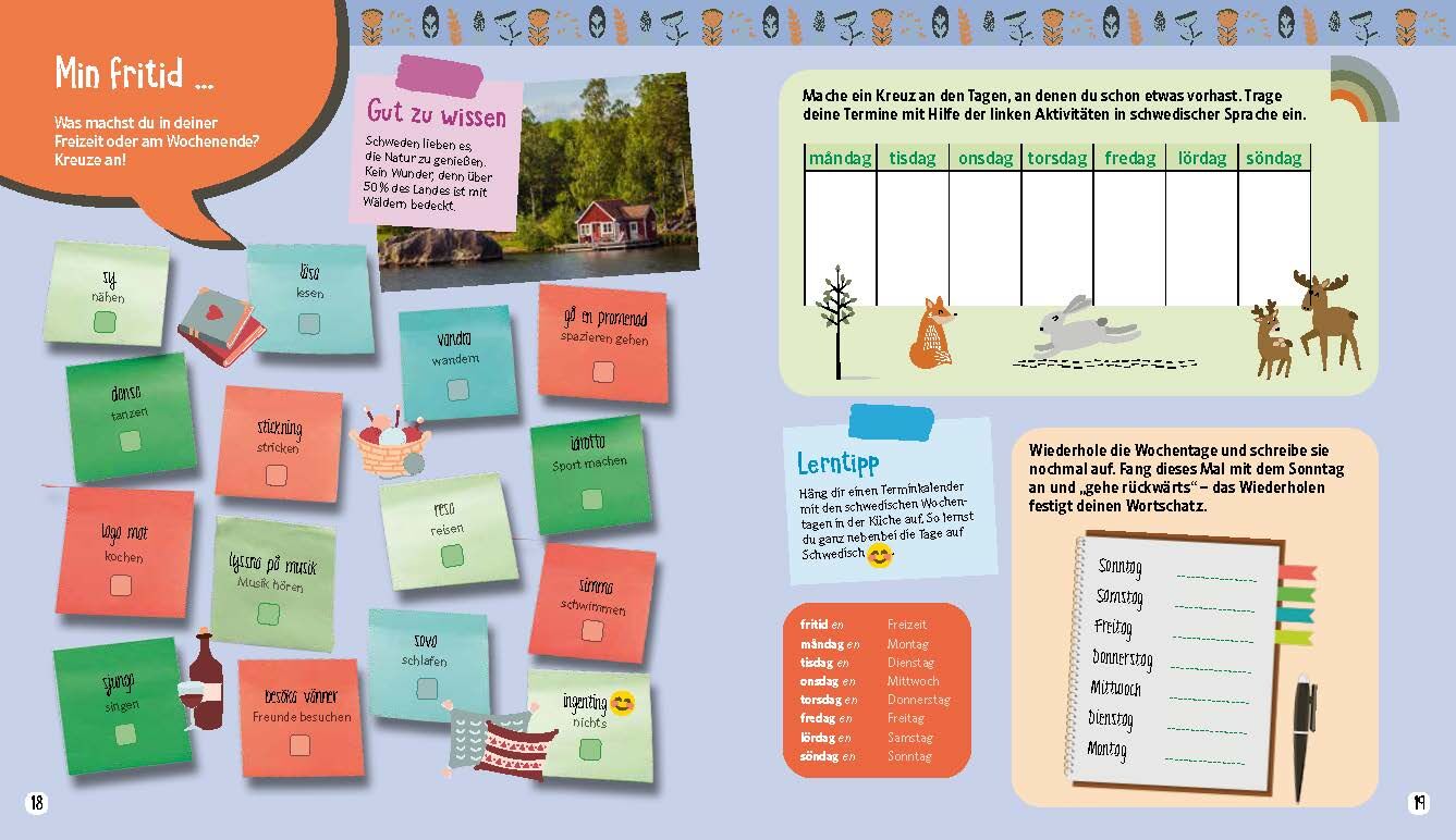 Unterhaltsame Inhalte wie beispielsweise das Rezept für die allseits beliebten köttbullar, verschiedene Vokabeln und Ausdrücke zum Thema Freizeit und Hobbys oder eine kunterbunte Schweden-Karte, die dazu einlädt, das nächste Reiseziel auszusuchen der Spaß beim Schwedisch lernen steht hier im Vordergrund! Der aktuelle Trend von Feel good und hygge wird somit in den Sprachenbereich aufgenommen. Ergänzt durch Rätsel und zahlreiche Übungen, aber ohne Fokus auf lästige Grammatikregeln ganz unkompliziert. So wird eine Verbindung hergestellt zwischen Wohlfühlmomenten und Sprachenlernen!
