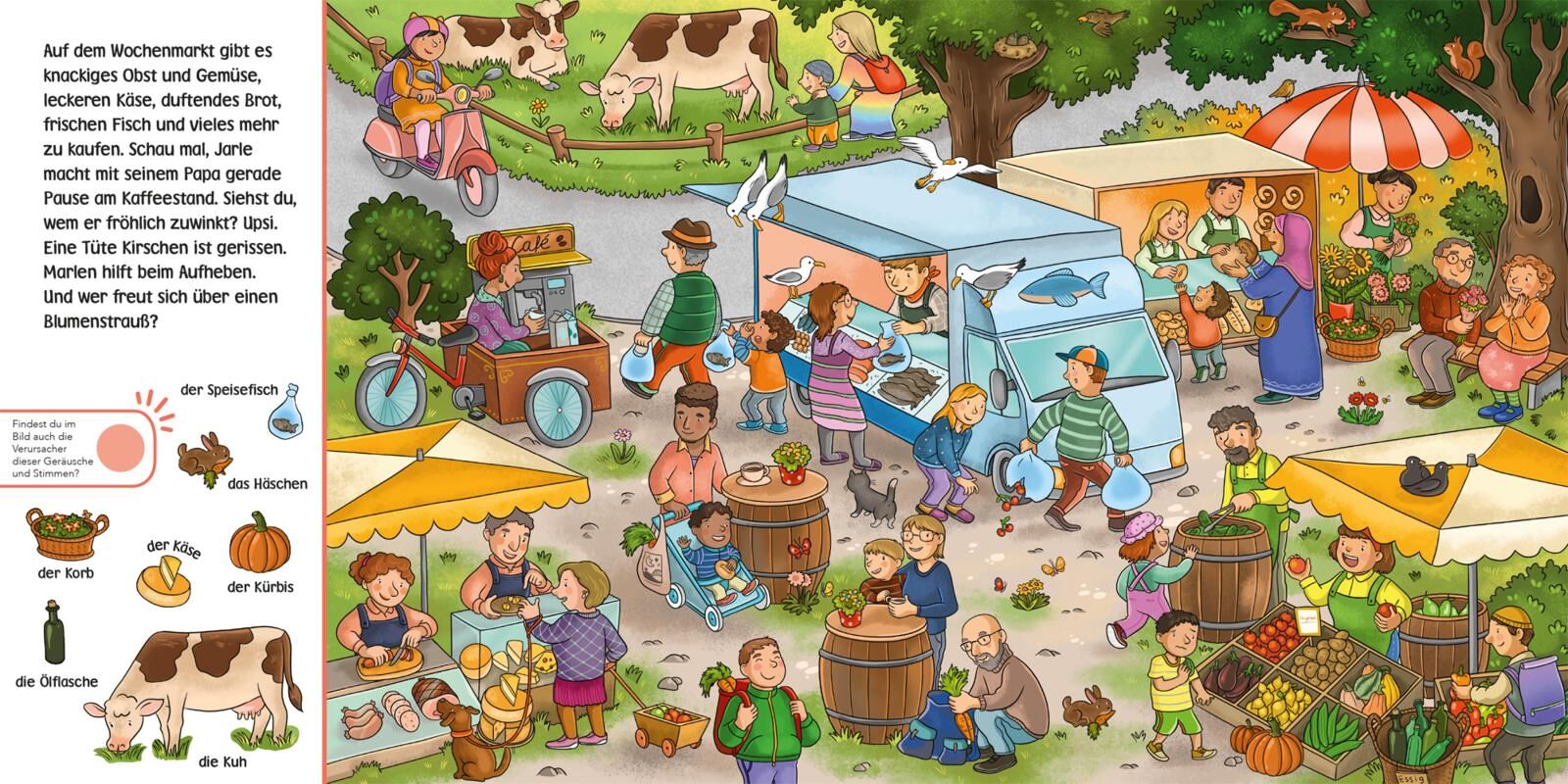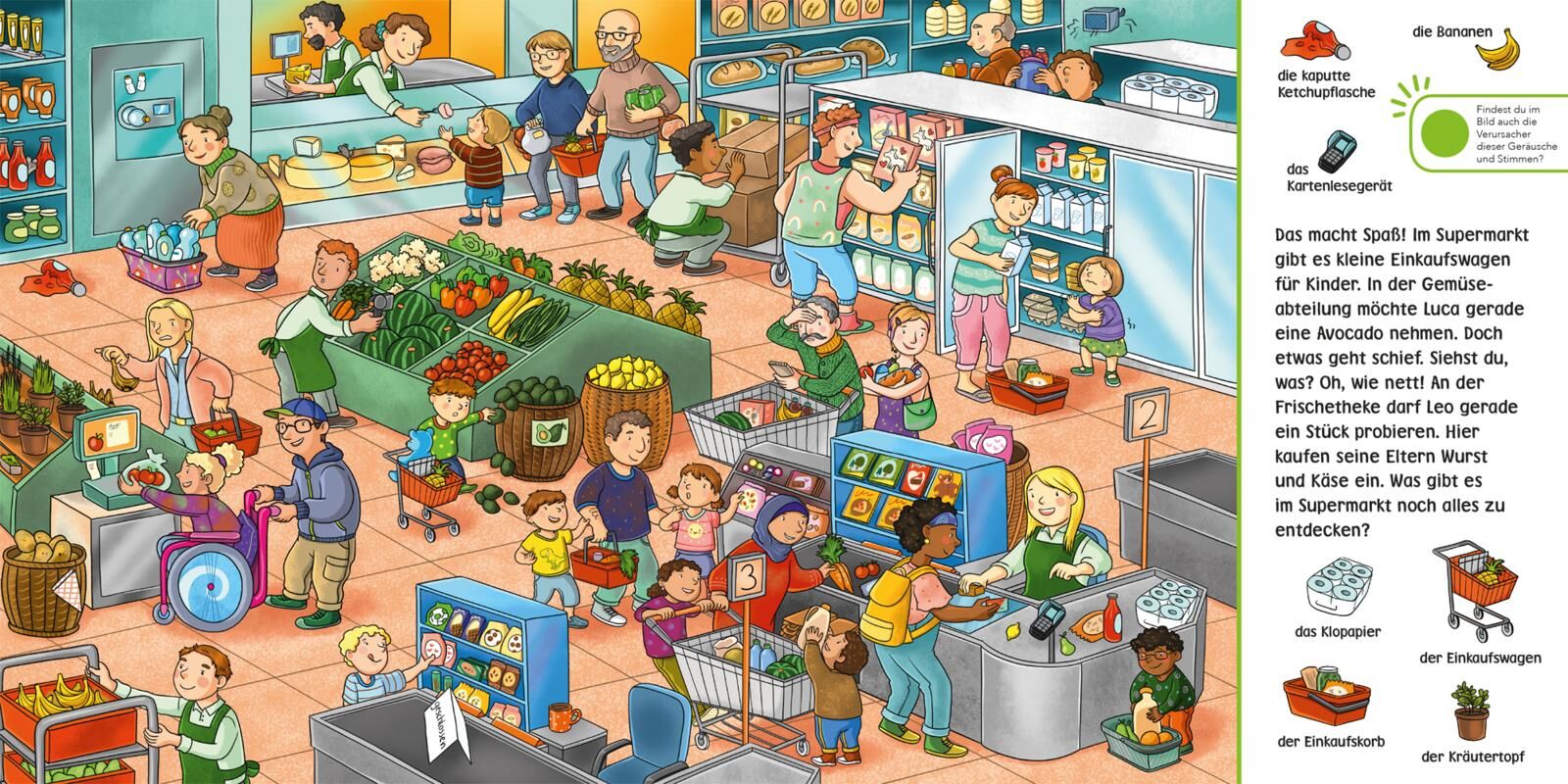 Ein Wimmelbuch mit alltagsnahen Sounds zum Suchen und Finden, Lernen und Wachsen. Einkaufen macht Spaß! In diesem lustigen Wimmelbuch können die Kinder bekannte Situationen aus dem Alltags nacherleben: Was gibt es im Supermarkt zu entdecken? Was kaufen die Me...