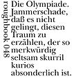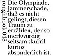 Der jüngste Gedichtband von Elke Erb beginnt mit einem älteren Text, "Die Olympiade" von 1970, wie alle Texte in diesem Buch im Sommer, den Elke Erb jeweils in Wuischke verbringt, "aus dem Tagebuch geholt" und hier zum ersten Mal veröffentlicht: "Jammerschade,...
