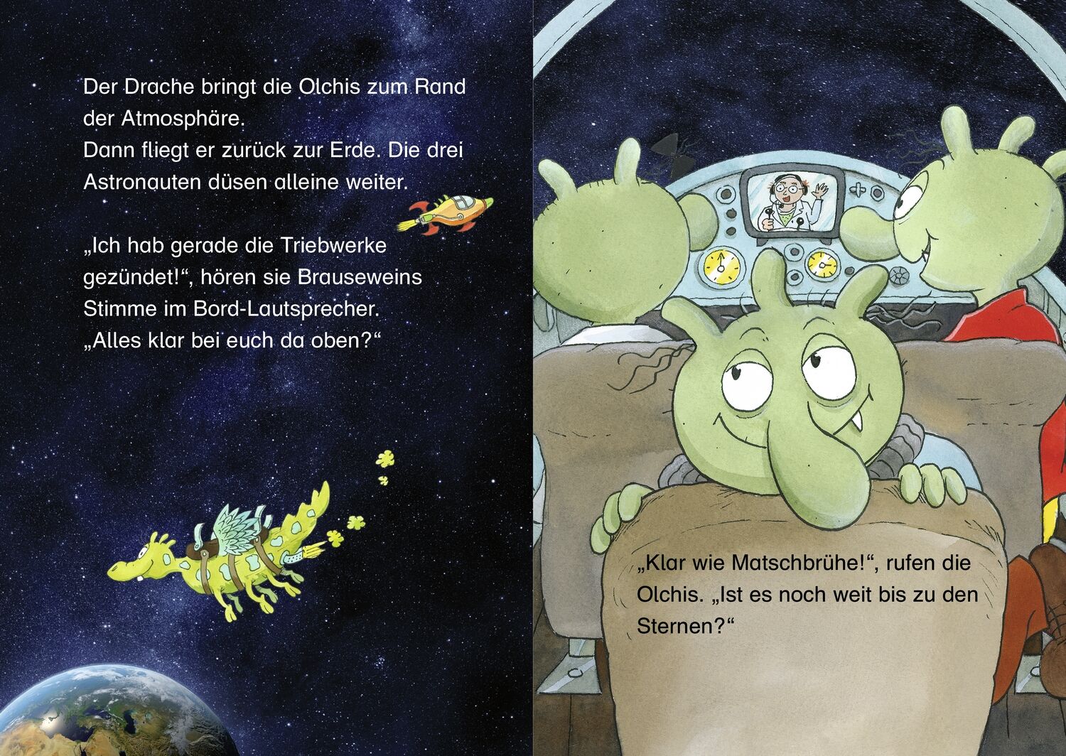 Eine galaktische Reise Als sie von ihrer Müllkippe aus den Sternenhimmel beobachten, fassen die Olchis einen Plan: Sie möchten ins Weltall reisen! Doch die von Olchi-Papa gebaute Rakete explodiert schon, bevor es losgeht. Da kann nur Professor Brausewein helf...
