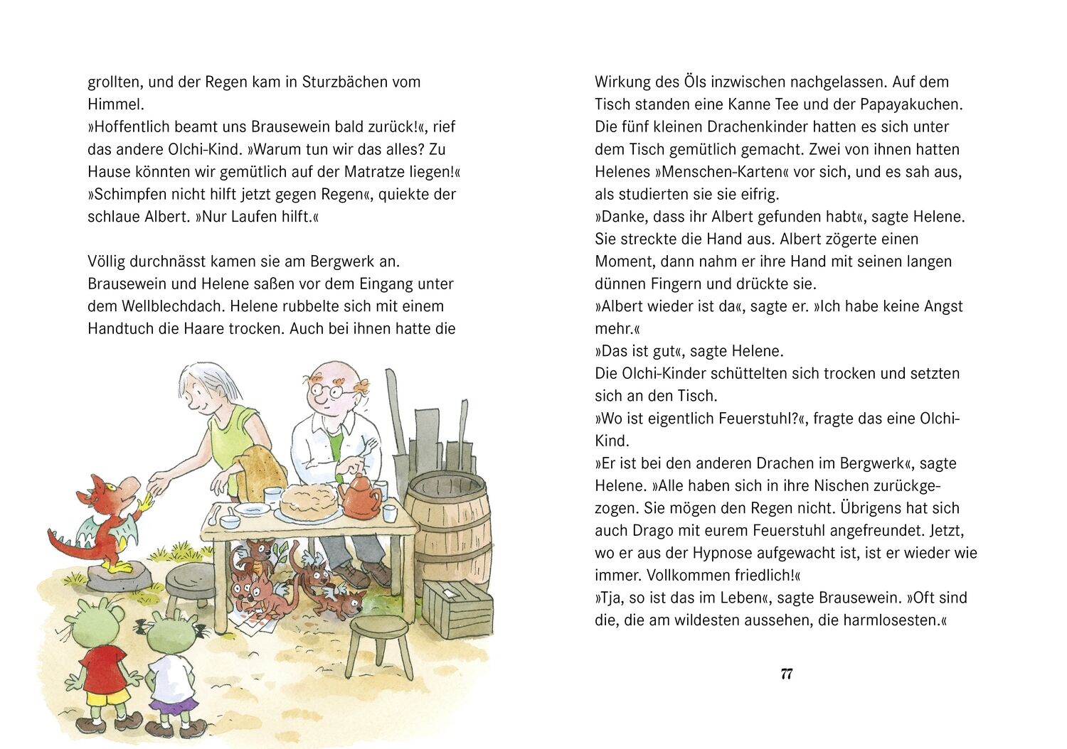 Auf einer Insel, weit weg im Ozean, lebt Helene, eine Freundin von Professor Brausewein. In einem versteckten Bergwerk erforscht sie dort Drachen. Doch jetzt machen ihr zwei ihrer Schützlinge Ärger und sie bittet den Professor um Hilfe. Mit der Zeitmaschine sausen Brausewein und die Olchi-Kinder zu Helene. Denn warum hat sich der kleine Albert in Helenes Labor verschanzt und was treibt er da? Und warum ist Drago auf einmal so böse geworden und lässt niemanden in die Nähe des Labors? Ein schwieriger Fall für die Olchis und Brausewein. Aber wer weiß, vielleicht dürfen sie am Ende zur Belohnung einen von Helenes kleinen Drachen mit nach Schmuddelfing nehmen?
