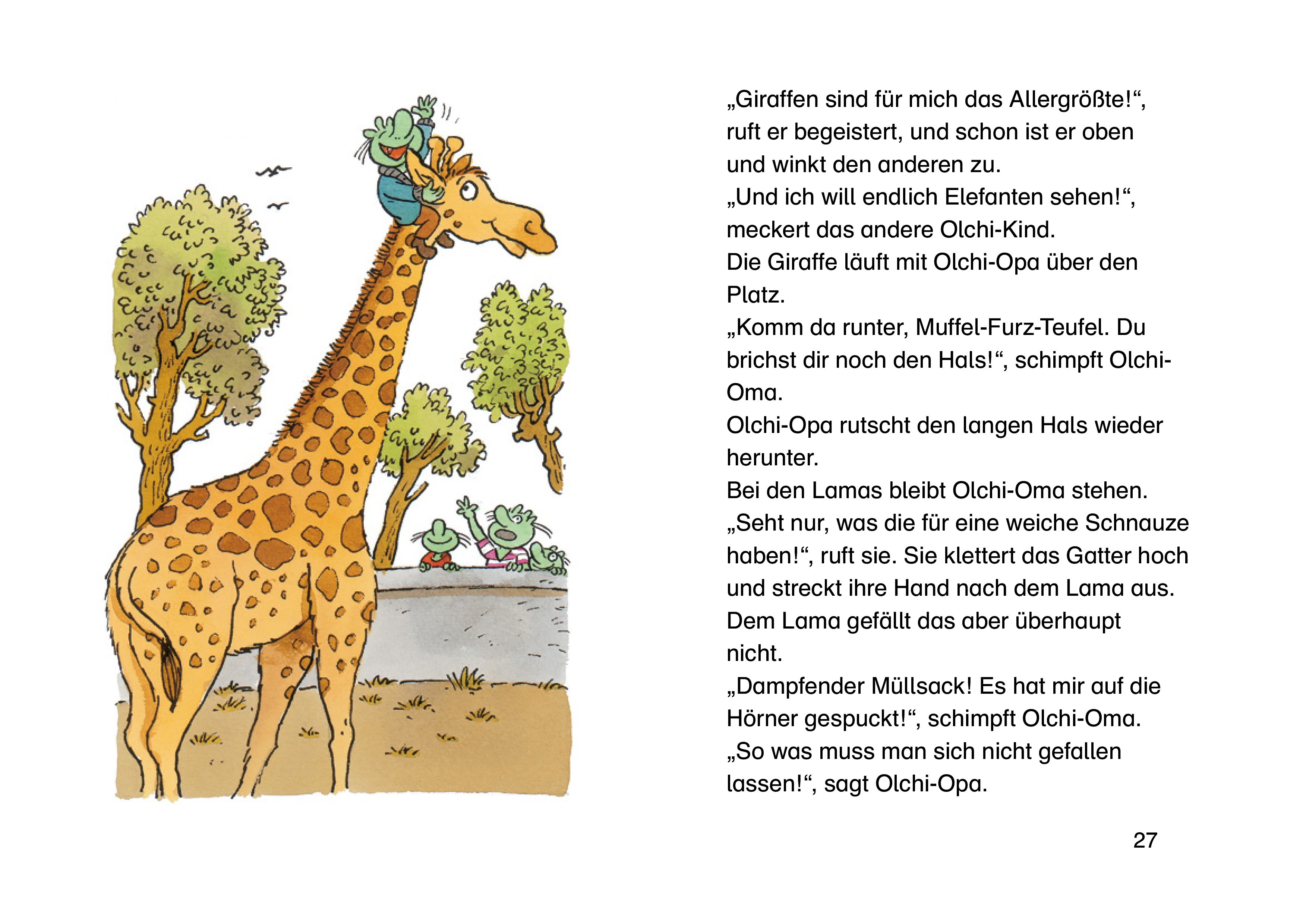 Krötiger Olchi-Spaß im Zoo. "Schlabber-Kröten-Furz! Ihr habt ja wohl gar keine Ahnung", raunzt der Olchi-Opa. Denn die Olchi-Kinder wissen nicht einmal, was ein Elefant ist. Das kann auch ein Olchi nicht durchgehen lassen und deshalb machen Olchi-Oma und Olch...