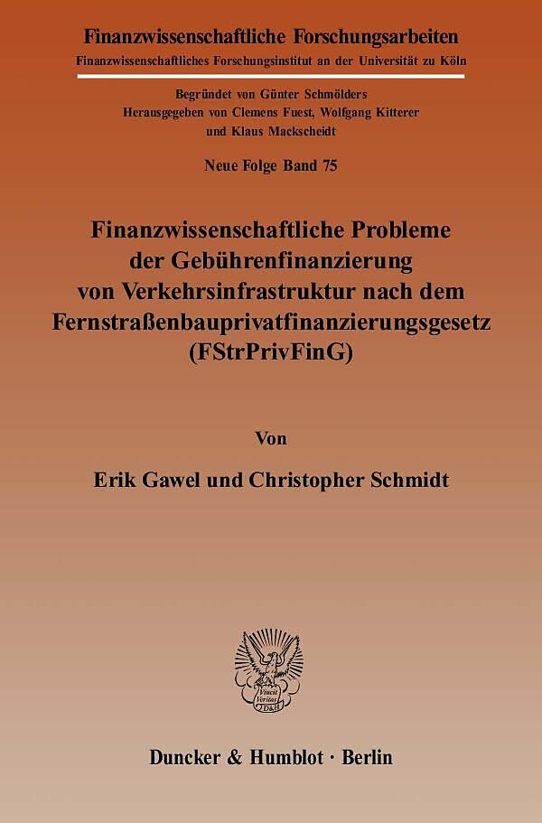 Inhaltsübersicht: A. Einführung: Ausgangslage und Problemstellung - Gang der Untersuchung - B. Wachstums- und strukturpolitische Begründungen für Verkehrsinfrastrukturmaßnahmen: Vorbemerkung - Wachstums- und Strukturpolitik als Zielfelder von Infrastrukturmaßnahmen - Theoretische Begründung für eine staatliche Bereitstellung von Verkehrsinfrastruktur - Verfassungsrechtliche Vorgaben für die Bereitstellung von Verkehrsinfrastruktur - C. Traditionelle öffentliche Verkehrsinfrastrukturfinanzierung: Vorbemerkung - Die traditionelle Finanzierung von Verkehrsinfrastrukturinvestitionen - Ausgaben für Bundesfernstraßen - D. Formen der Entgeltfinanzierung für die private Finanzierung öffentlicher Verkehrsinfrastruktur: Vorbemerkung - Modelle der Entgeltfinanzierung - Zusammenfassung - E. Gegenüberstellung privater und öffentlicher Finanzierung: Vorbemerkung - Die Vorteile einer privatwirtschaftlichen Realisierung im Überblick - Effizienzansprüche an eine Privatisierung der Infrastrukturbereitstellung - Privatisierung und optimale Risikoallokation - Zusammenfassung - F. Erfahrungen mit Betreibermodellen im In- und Ausland, insbesondere dem FstrPrivFinG: Vorbemerkung - Grundsätzliche Erfahrungen mit Mautprojekten im In- und Ausland - Die gesetzliche Grundlage für die F-Modelle - Das FStrPrivFinG in der praktischen Umsetzung. Die bereits abgeschlossenen und gescheiterten Projekte - G. Hemmnisanalyse der Betreibermodelle (F-Modelle) nach dem FstrPrivFinG: Institutionelle Hemmnisse - Ökonomische Hemmnisse - Politökonomische Hemmnisse - H. Fallstudie: Der Gebührenhebel als Preissetzungsinstrument bei F-Modellen: Vorbemerkung - Zur Adäquanz der Gebühr zur Refinanzierung konkurrenzwirtschaftlicher Leistungsabgaben - Akzeptanzmant versus Kostendeckungsmaut als Lösungsansatz zur Sicherung der betriebswirtschaftlichen Rentabilität "kritischer Projekte" - Strategische Lösungsoptionen - Lösungsoption "Intertemporaler Verlustausgleich" - Lösungsoption "Intertemporaler Kostenverlagerung" - Lösungsoption "Preisdifferenzierung" - Lösungsoption "Subventionierung von Defiziten" - Einzelfragen der Kalkulation einer Akzeptanzmaut - Zusammenfassung - I. Empfehlungen - J. Fazit und Ausblick - Literaturverzeichnis - Stichwortverzeichnis