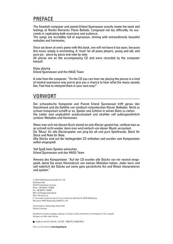 Der schwedische Komponist und Pianist Erland Sjunnesson trifft genau den Geschmack und die Gefühle von nordisch-romantischen Klavier Balladen. Nicht zu schwer komponiert schafft er es, Spieler und Zuhörer in seinen Bann zu ziehen. Die Lieder sind unglaublich a...