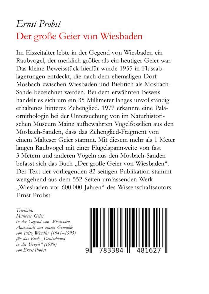 Im Eiszeitalter lebte in der Gegend von Wiesbaden ein Raubvogel, der merklich größer als ein heutiger Geier war. Das kleine Beweisstück hierfür wurde 1955 in Flussablagerungen entdeckt, die nach dem ehemaligen Dorf Mosbach zwischen Wiesbaden und Biebrich als M...