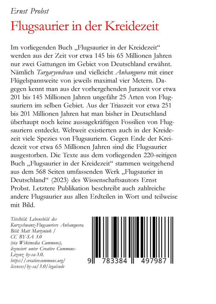 Im vorliegenden Buch Flugsaurier in der Kreidezeit werden aus der Zeit vor etwa 145 bis 65 Millionen Jahren nur zwei Gattungen im Gebiet von Deutschland erwähnt. Nämlich Targaryendraco und vielleicht Anhanguera mit einer Flügelspannweite von jeweils maximal vi...