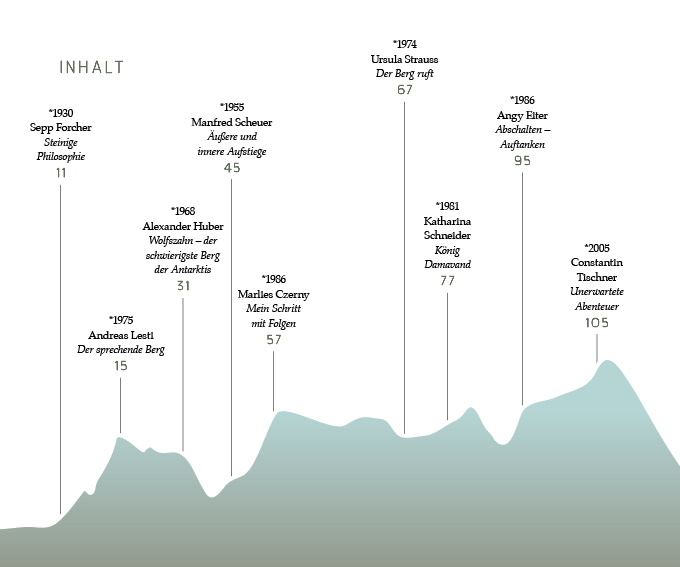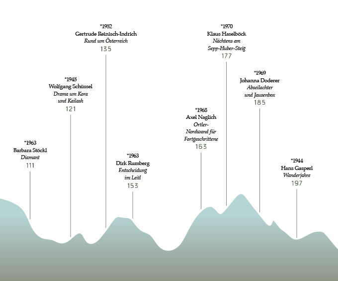 Menschen unterschiedlichsten Alters und Erfahrungsschatzes haben ihre Geschichten zu diesem Werk beigetragen: Sepp Forcher, Ursula Strauss, Barbara Stöckl, Alexander Huber, Wolfgang Schüssel, Christina Bauer, Johanna Doderer, Andi Kornhofer, Axel Naglich, Angy...