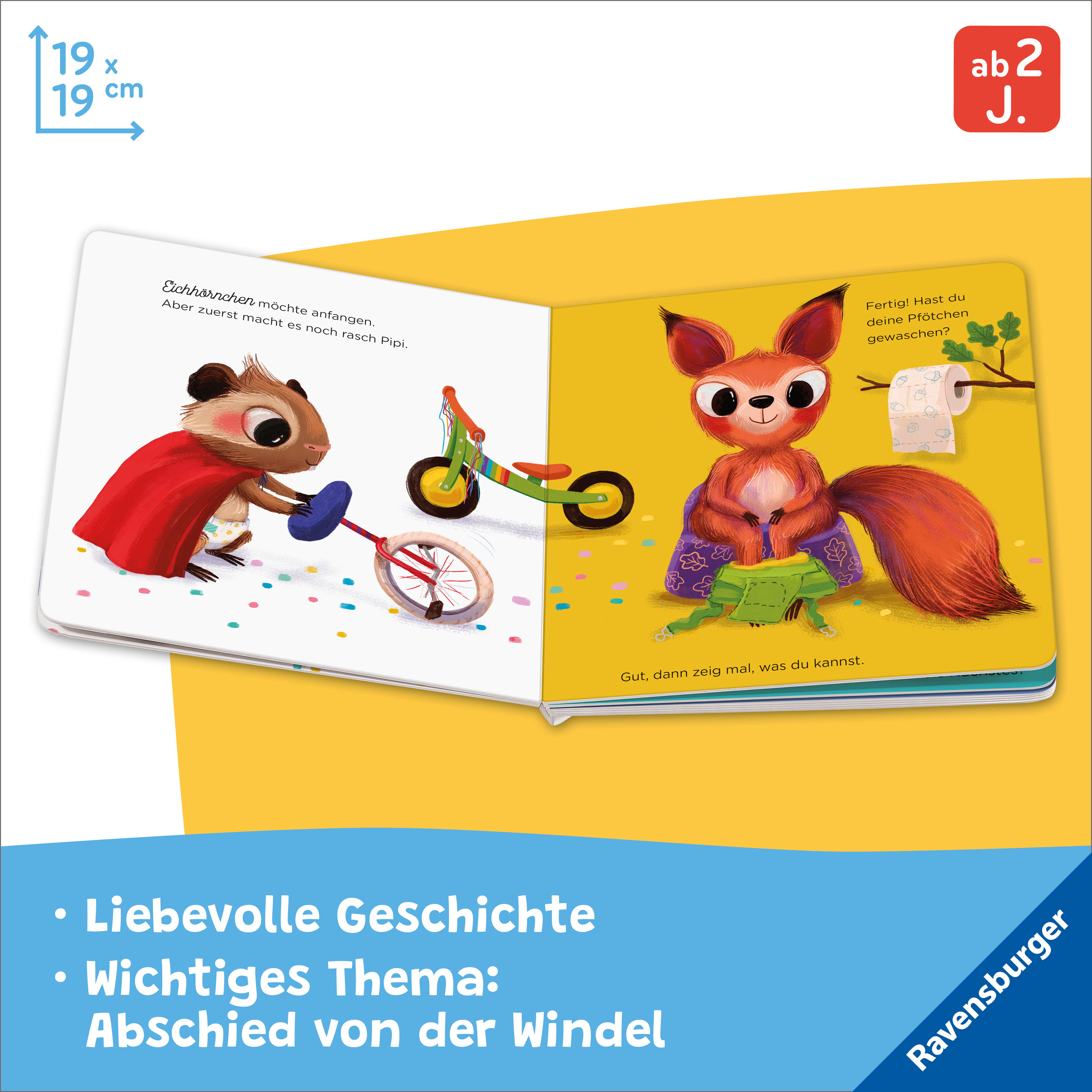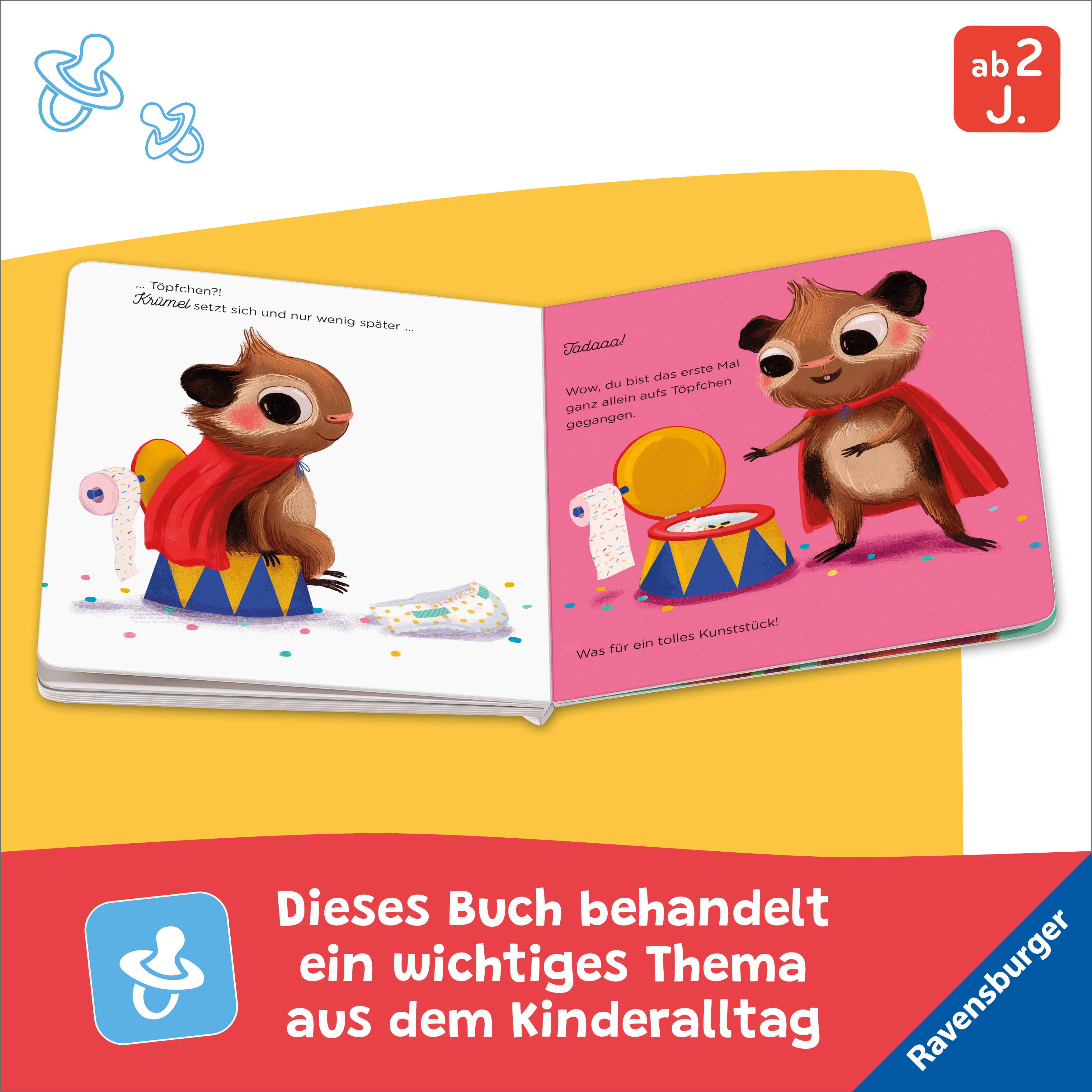 Lustiges Pappbilderbuch, mit dem Kinder zu Töpfchenfans werden Alle Tiere führen tolle Kunststücke auf Krümel ist begeistert! Davor geht jedes Tier zur Sicherheit auch noch schnell aufs Töpfchen. Nur Krümel trägt noch eine Windel. Zum Schluss zeigt Krümel jedo...