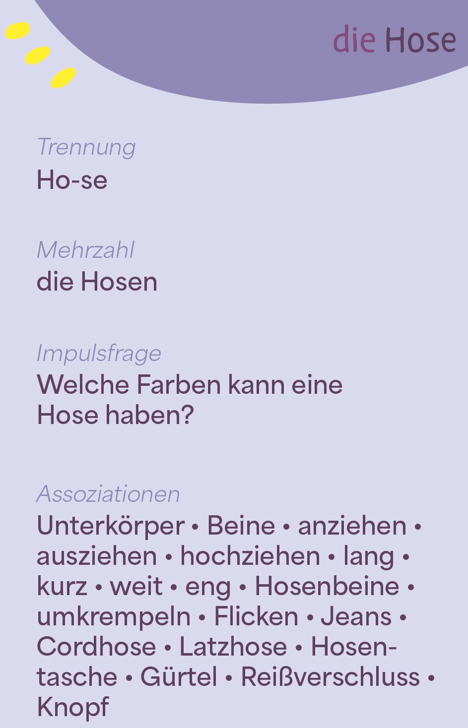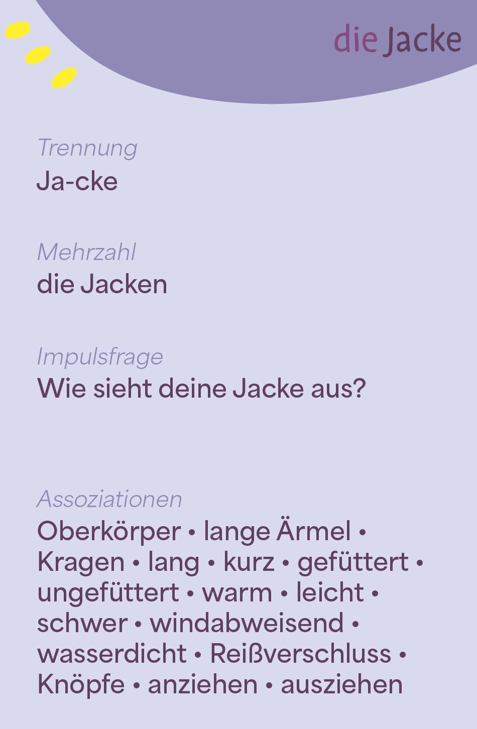 Alltagswörter spielerisch entdecken! Jacke, Hose, Bademantel mit diesen liebevoll illustrierten Wortschatzkärtchen lernen die Kinder alltägliche Lebensmittel spielerisch kennen. Die Rückseiten bieten praktische Informationen wie Mehrzahlformen, Silbentrennung ...