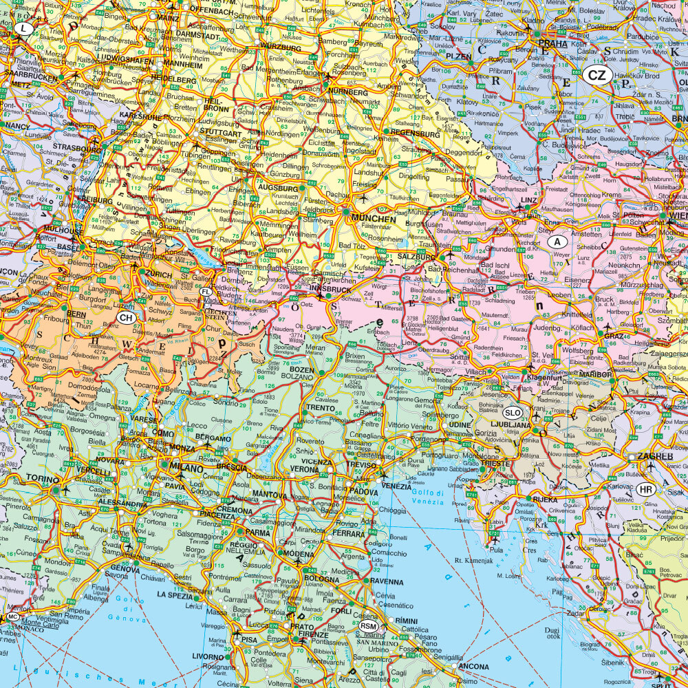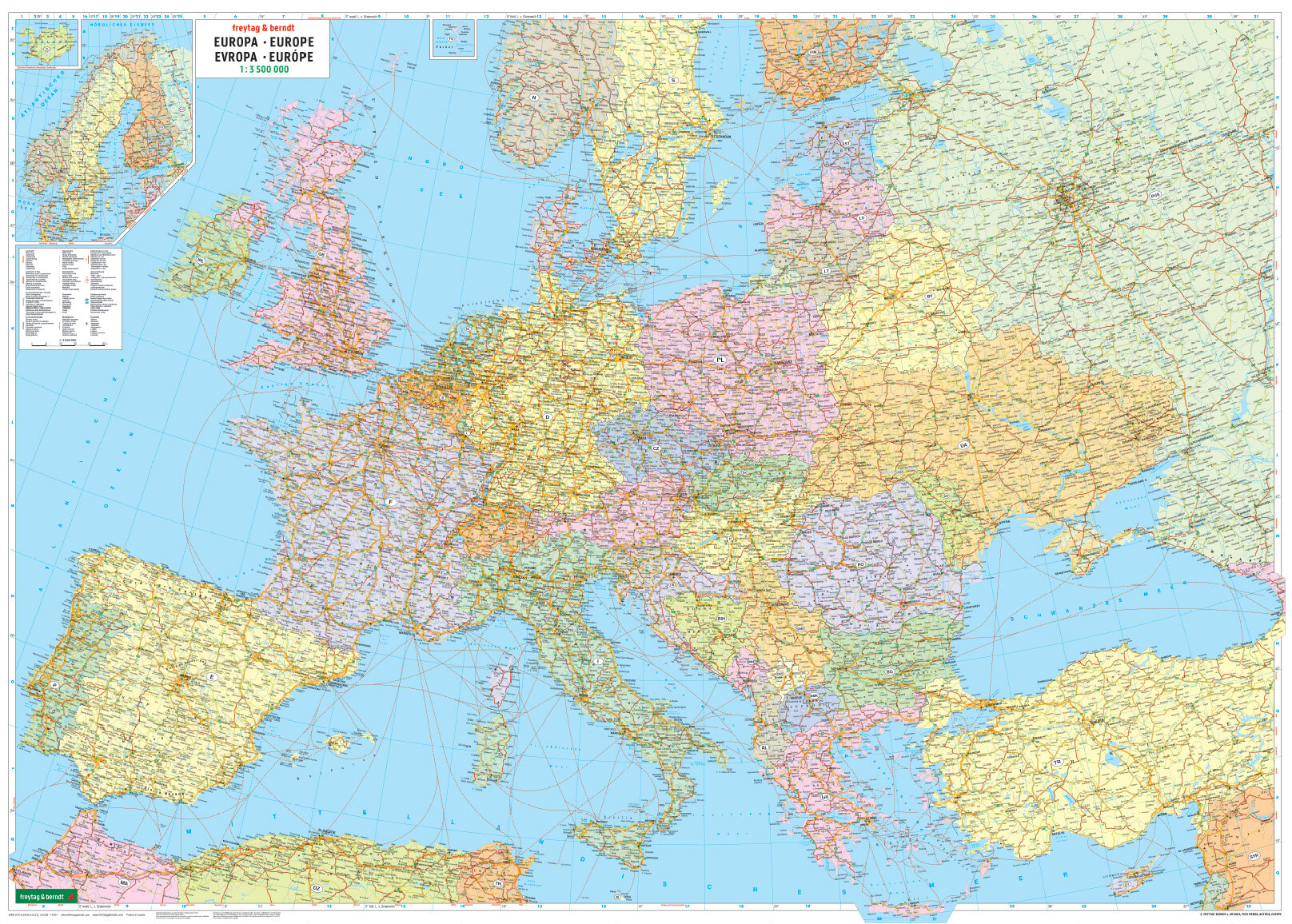 Mit der Straßenkarte Europa politisch im Maßstab 1:3.500.000 finden sich Urlauber die mit Auto, Motorrad oder Wohnwagen unterwegs sind bestens zurecht. Das weit verzweigte Straßennetz ist exakt abgebildet, Entfernungen und viele Ausflugsziele sind in der Karte...