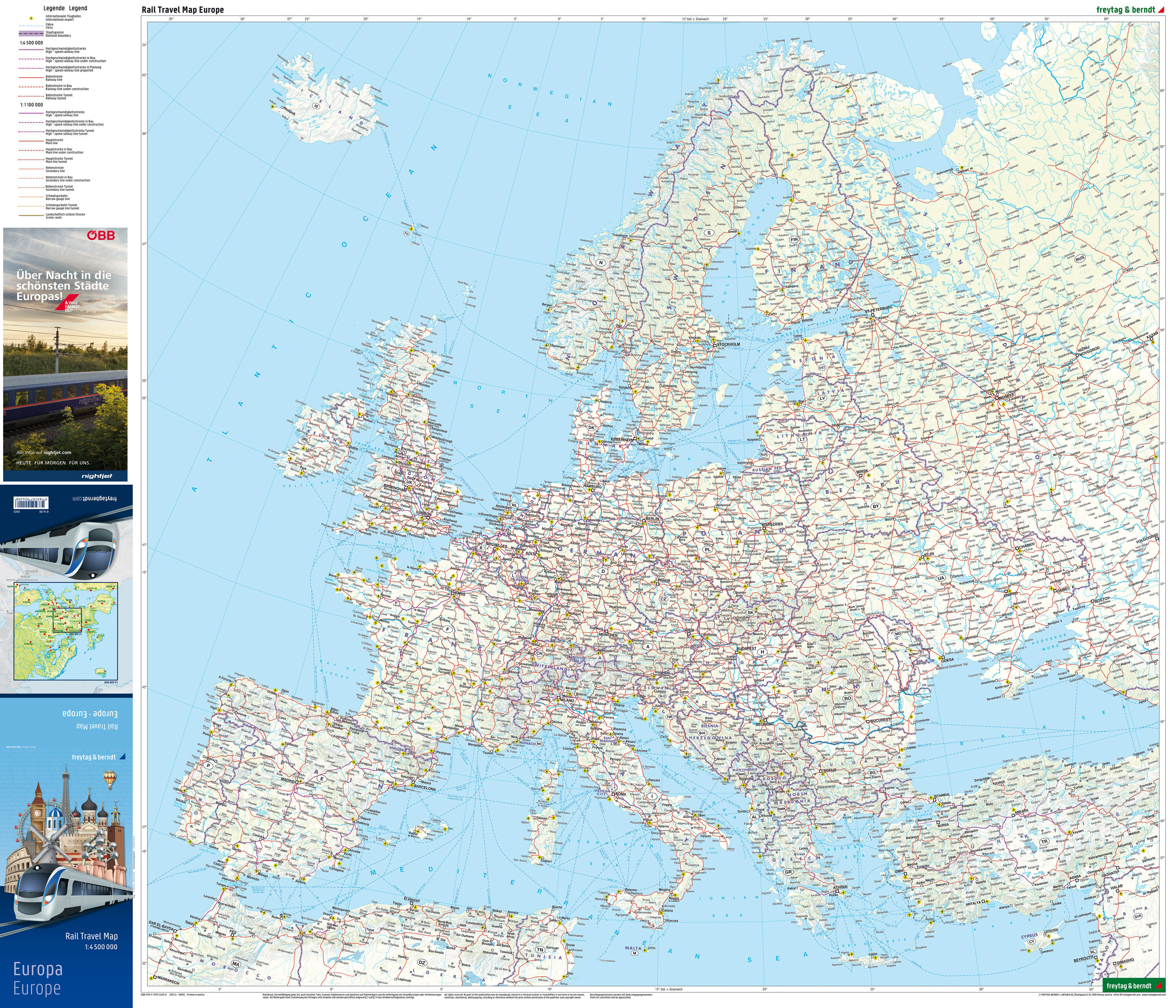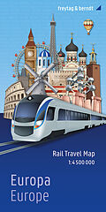 Die Eisenbahnkarte Europa von freytag & berndt ist ein Muss für Eisenbahnfans, Trainspotter und Interrailer! Sie deckt ein beeindruckendes Gebiet ab von den nördlichsten Punkten am Nordkap bis zum Roten Meer und von Marrakesch im Westen bis Taschkent im Os...