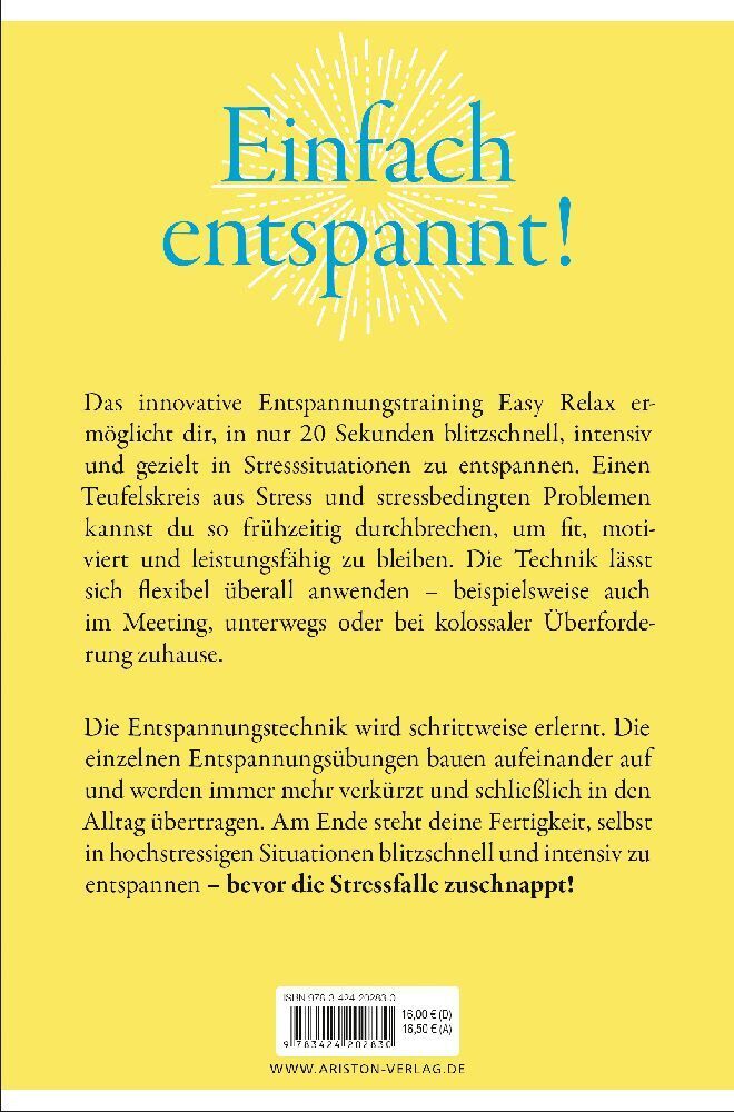 Tiefenentspannt in 20 Sekunden Das innovative Entspannungstraining Easy Relax, ermöglicht es in 20 Sekunden blitzschnell, intensiv und gezielt in Stresssituationen zu entspannen. Ein Teufelskreis aus Stress und damit einhergehenden Problemen kann so frühzeitig...