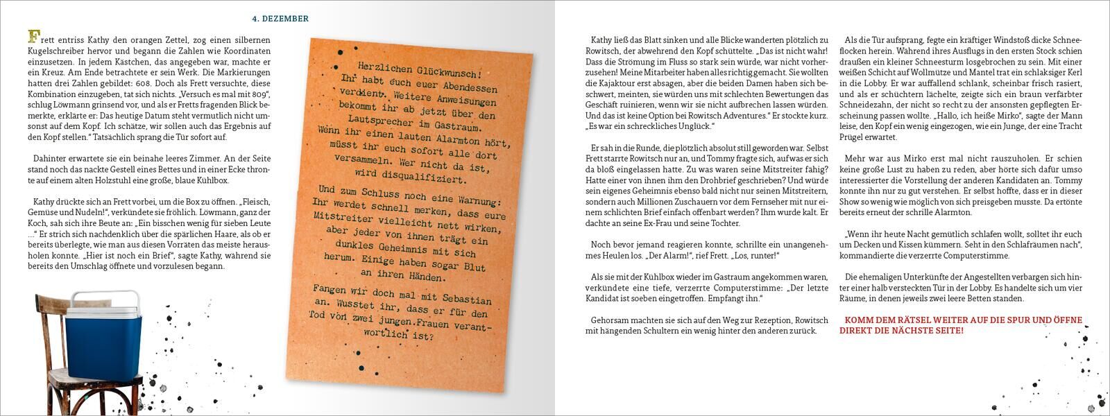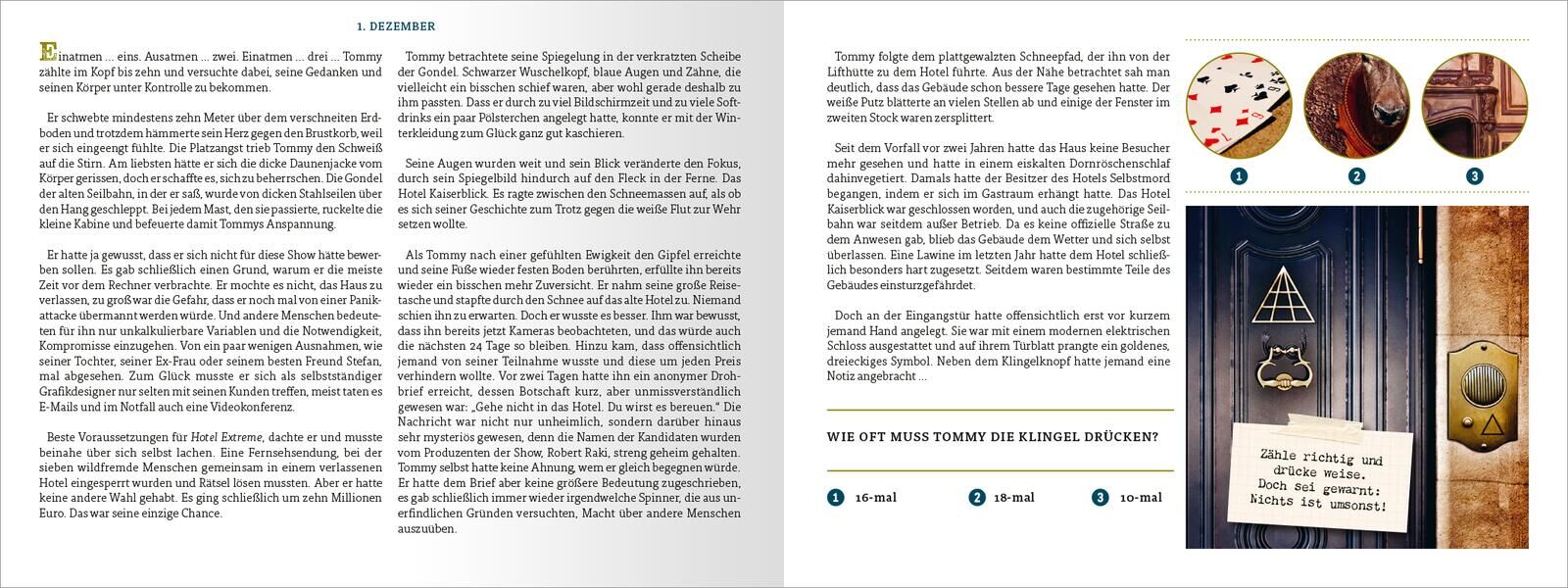 Das Hotel der tausend Augen. Der neue Escape Room Adventskalender von Eva Eich Ein verlassenes Hotel in den Bergen. Zehn Millionen Euro für den Sieger. Und ein Spiel um Leben und Tod. Die neue Weihnachts-Show Hotel Extreme verspricht echten Nervenkitzel: Sieb...30 Kunden haben diesen Artikel kürzlich gekauft.