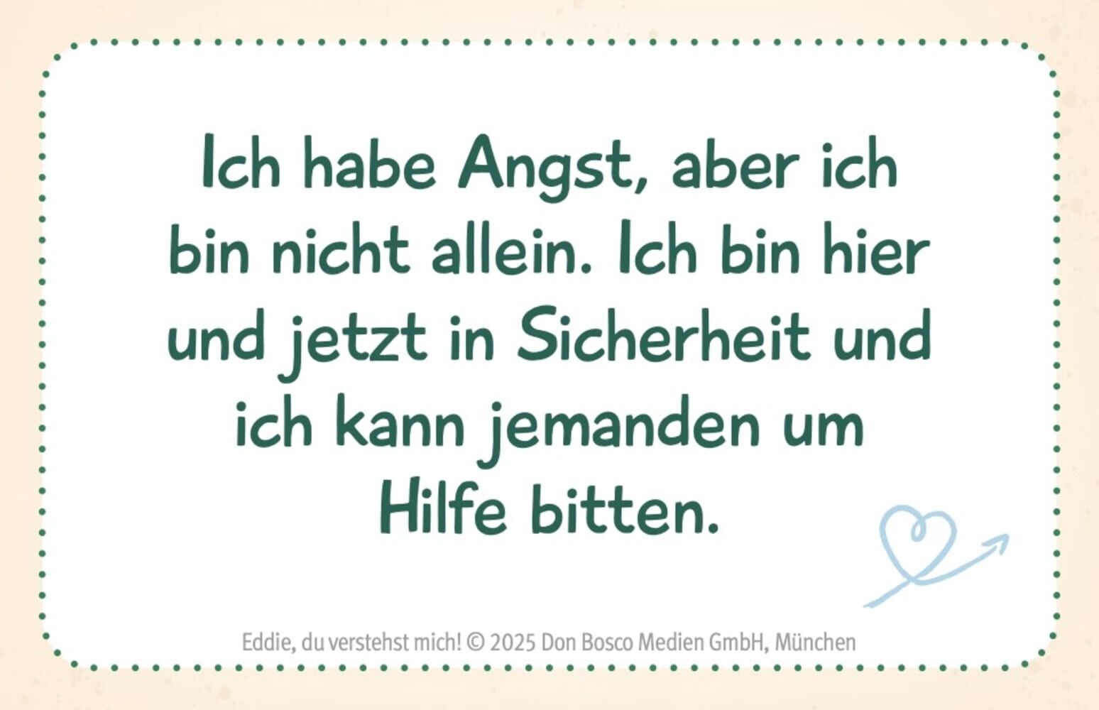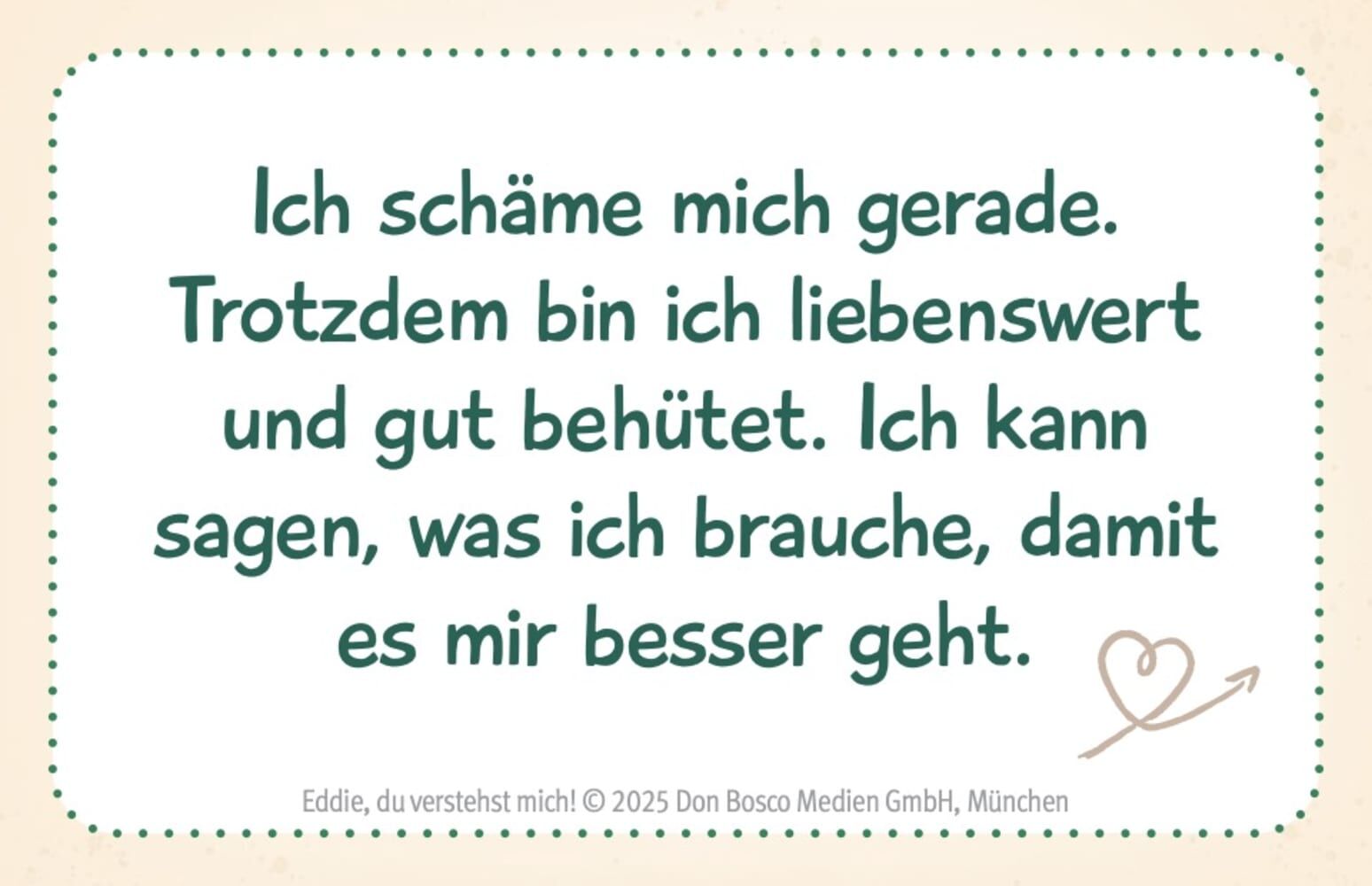 Auf der Vorderseite jeder Bildkarte ist Eddie in einer Gefühlslage zu sehen, auf der Rückseite steht eine Affirmation, die den Kindern vermittelt, dass es in Ordnung ist, dieses Gefühl zu haben und die ihnen zeigt, dass sie mit diesem Gefühl nicht alleine sind. Mit Eddie haben die Kinder einen Begleiter, der genauso fühlt wie sie. Er ist stolz und er schämt sich mit ihnen - und er sagt: Es ist okay, wie du dich fühlst! Du bist geborgen und geliebt und das Gefühl geht wieder vorbei.