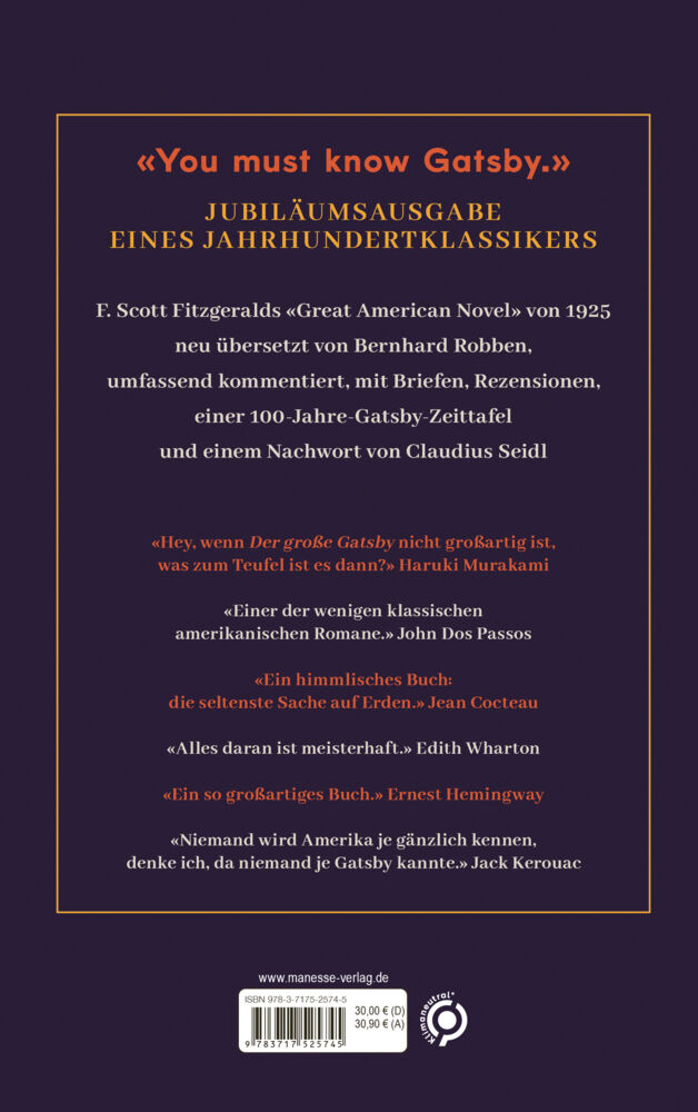 Ein Jahrhundertbuch wird 100! Erzählerisches Meisterwerk und die Great American Novel des 20. Jahrhunderts in Neuübersetzung als Jubiläumsausgabe mit 100-Jahre-Gatsby-Zeittafel «Hey, wenn Der große Gatsby nicht großartig ist, was zum Teufel ist es dann?» Haruk...